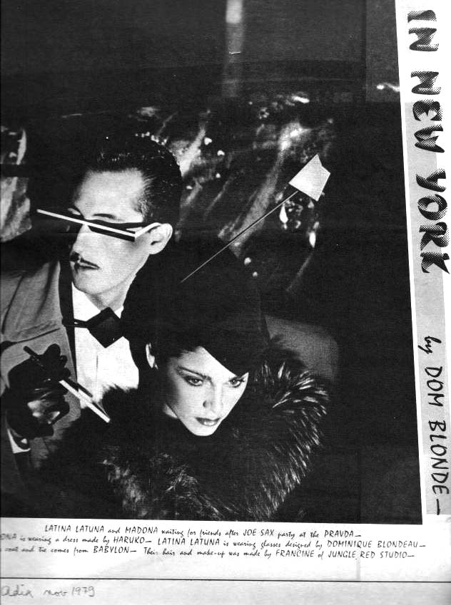 En diciembre de 1979, Madonna aparece en una fotografía instantánea en la revista «Adix». La joven todavía desconocida aparece junto Latina Latuna en una fiesta de Joe Sax en el «Pravda Artspace» (copropietario Rudolf Piper) ubicado en el N°281 de la calle Lafayette en SoHo, New York. Madonna estaba vestida por Haruko y peinada por Francine de «Jungle Red Studio».