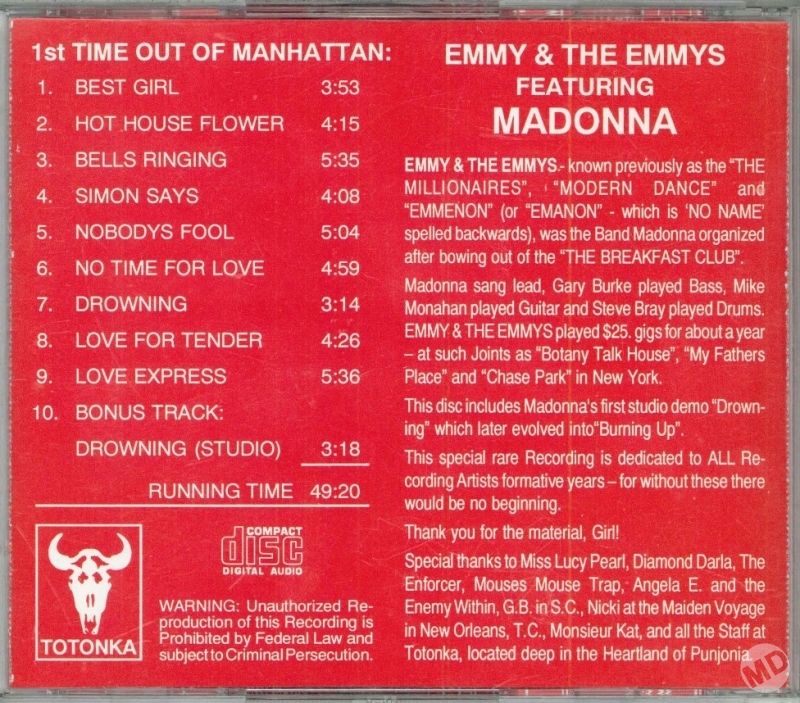 De todo el cancionero de “Emmy” solo cuatro canciones fueron grabadas profesionalmente en estudio. El resto de los temas se obtuvieron de una grabación en vivo cuando la banda se presentó en el “Botany Club” en Diciembre de 1980. De esta grabación salió el CD bootleg más conocido de esta época de Madonna: “Emmy and The Emmy: First Time Out of Manhattan”, editado por Totonka Records en 1994.