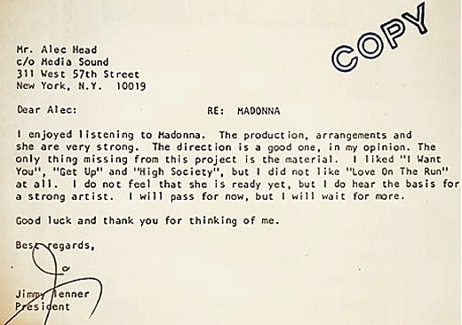Según su contrato con «Gotham Records», de 22 de julio de 1981, Madonna debía cobrar USD 250 por cada máster no publicado y USD 500 por cada uno publicado, más un 3% del precio de cada disco vendido. Ese demo se puso en circulación y fue rechazado por firmas como «Geffen» y «Atlantic Records». La propiedad de esas canciones fue objeto de una larga batalla legal desde el momento en que Madonna firmó por Warner Brothers Records. En una de las varias cartas de rechazo a Madonna por las disqueras se podía leer: «Disfruté escuchando a Madonna. La producción, los arreglos y ella son muy fuertes. La dirección es buena en mi opinión. Lo único que le falta a este proyecto es el material. Me gustó ‘I Want You’, ‘Get Up’ y ‘High Society’ pero no me gustó para nada ‘Love on the Run’. No creo que ella esté lista todavía pero si veo las bases de una gran artista. Por el momento pasaré de ella pero espero por más…»