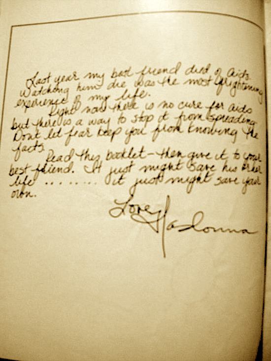 “El año pasado mi mejo amigo murió de Sida. Verlo morir fue la experiencia más devastadora de mi vida. Lo cierto es que aún no hay cura para el Sida, pero si existe una manera de evitar que siga diseminándose. No dejes que el miedo, te mantenga sin saber los hechos. Lee esta información y luego pásalo a tu mejor amigo. Puede que esto salve su vida…puede que salve la tuya también”. (Madonna)