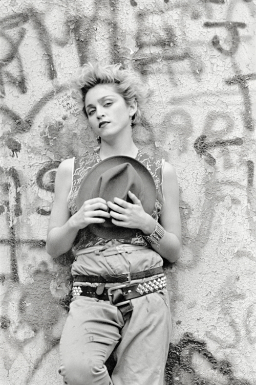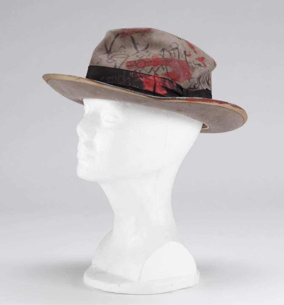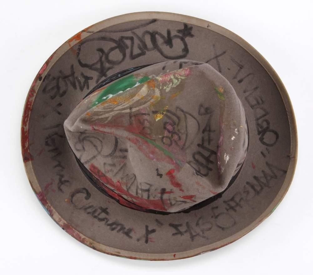 Sombrero de hombre “Fedora” de ala corta en felpa color gris claro con cinta negra. Intervenido por Martin Burgoyne con manchas de pintura e inscripciones tipo grafiti. Además de Burgoyne, participaron con las incripciones Dondi, Fab5, Freddie, Ronnie Cutrone, Daze, RP3 y Zephyr, entre otros. El sombrero fue regalado a un amigo de Madonna que vivía en un loft al lado de su departamento en el Soho a principios de los 80’s. Este sombrero es el que utilizó Madonna para la sesión fotográfica de Peter Cunningham.