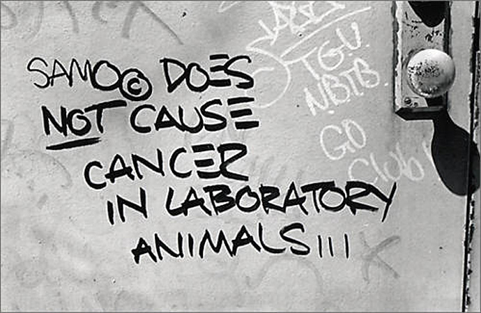 Algunas de estas frases eran: “Samo salva idiotas”; “Samo pone fin al lavado de cerebro religioso, la política de la nada y la falsa filosofía”; “Samo como alternativa a la alimentación de plástico”; “Medios de comunicación lavado de cerebro”; “Microondas y Video X : Resistencia”; “Big-Mac certificado”; “Para Navidades: Samo”. Nadie sabía quién era o quienes eran, ahí aumentaba la intriga. Críticos de arte comenzaron a seguirle la pista y a hablar de su obra, decían que antes al ir por la calle, algunas zonas eran poco interesantes, pero desde que SAMO estuvo allí, esas calles cambiaron. La visión hacia el graffiti había modificado, se daba a entender que había un razonamiento previo, una explicación, no eran sólo manchas o pintadas sin sentido.