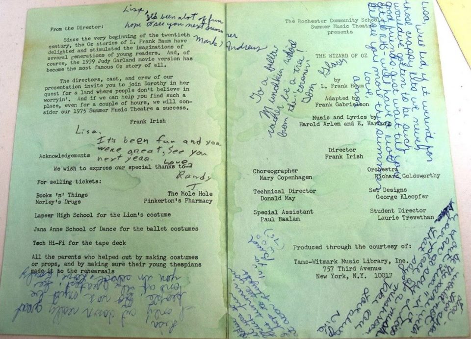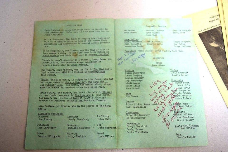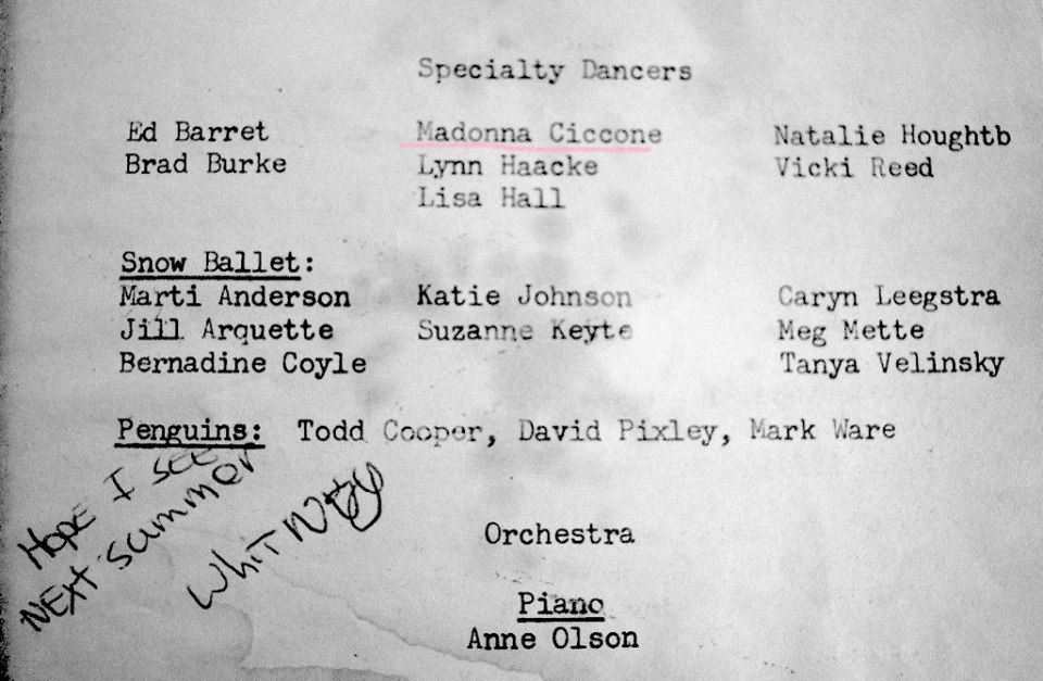 «Cada verano, nuestro distrito escolar ofreció un ‘Teatro de Música de Verano’ para estudiantes de 5to grado de High School. Era un programa de escuela de verano en el que todos los que estaban interesados en un papel, participaron en una audición general para el Director. Los roles fueron asignados en base a habilidades y nivel de desempeño. A Madonna (y a mí) no se nos concedió hablar o cantar pero sí fuimos emitidos como ‘bailarines principales’. La versión teatral del Mago de Oz tenía varias escenas de ‘baile’ no incluidas en la versión de la película y fueron interpretadas por los nosotras. Hubo tres bailes: el ‘Jitterbug’, ‘Snow Ballet’ y ‘Celebration Ballet’ que Madonna (además de mí y otro) presentamos durante el show. En retrospectiva, pienso en el hecho de que no fuimos lo suficientemente buenos en el momento de ser emitidos en una parte de canto sino sólo en el baile!»