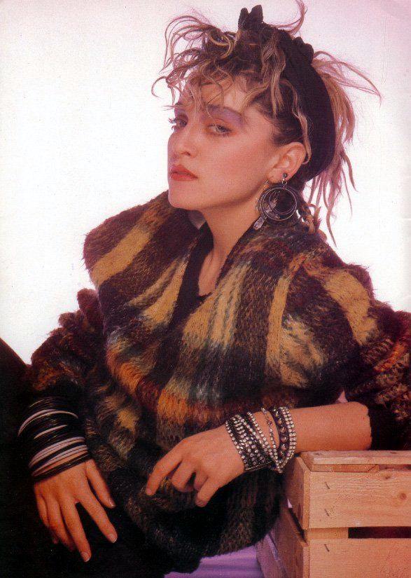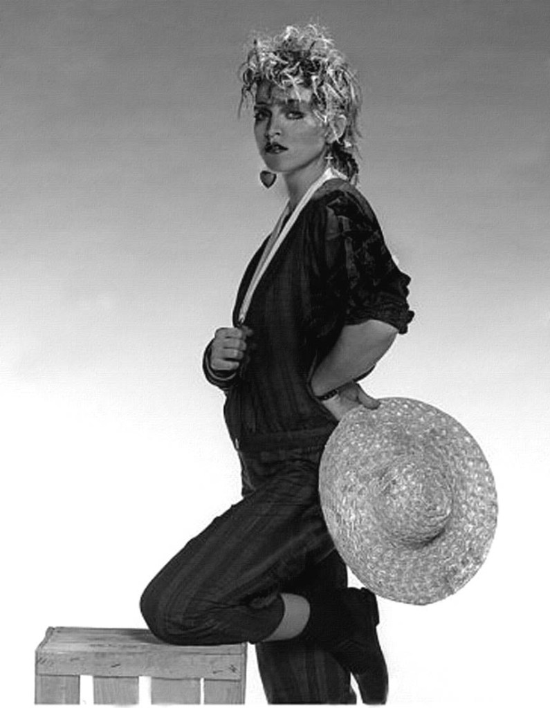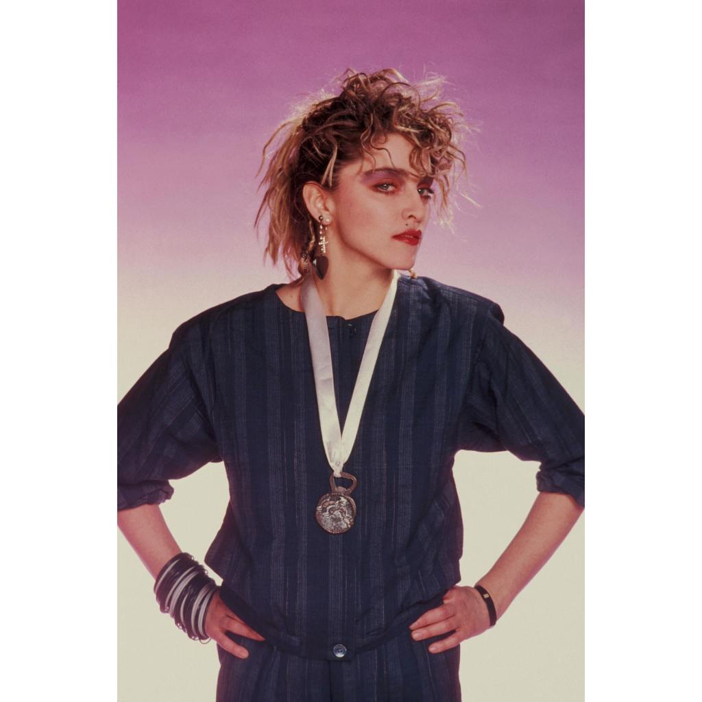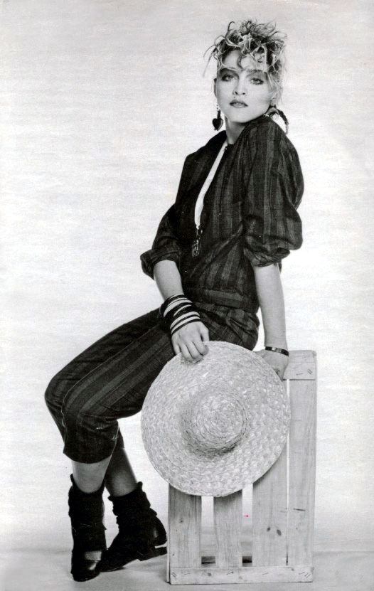 Este trasfondo editorial ayuda a comprender uno de los aspectos más intrigantes de la sesión: la coexistencia de dos estéticas claramente diferenciadas. Por un lado, Madonna aparece con pantalones y top a rayas, sombrero de paja y un suéter de mohair a cuadros con escote en V, looks que responden más a una imposición editorial genérica que a su identidad artística. Ella luce también una especie de gran medalla colgada en su cuello, la misma que usó para la sesión de fotos de Brian Aris en enero de 1984 (lo cual es un indicio la fecha de la sesión de Bourdillon)