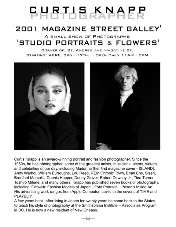 Se han realizado pocas exhibiciones de las fotografías de Madonna de Curtis Knapp, tal vez las mas conocidas fueron la que se realizó en 2010 en New Orleans y luego en 2015 en Barcelona. La primera, llamada «Studio Portraits and Flowers» («Retratos de Estudio y Flores») se llevó a cabo en la Galería 2001 Magazine Street en New Orleans desde el 3 al 17 de abril de 2010 y contenía retratos de Madonna, Andy Warhol, Robert Downey Jr., Brian Eno, Tina Turner, R.E.M, Dennis Hooper, Slash entre otros.