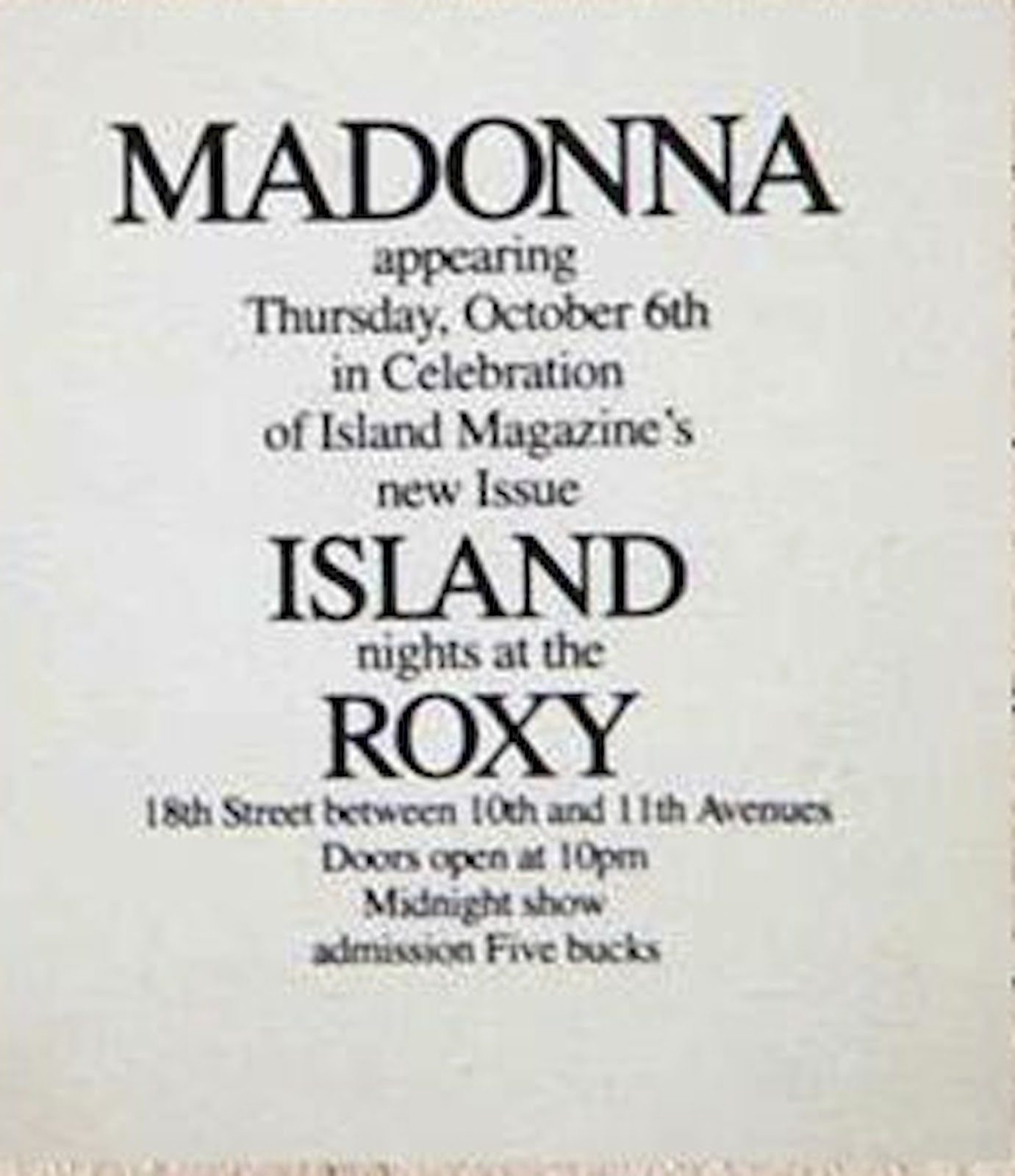 La revista realizó una fiesta promocional para amigos de la prensa a realizarse en el club “The Roxi” de New York el 6 de octubre de 1983. Esta una de las publicaciones más deseadas por los coleccionistas de Madonna y se ha convertido en un objeto prácticamente de culto, llegando a alcanzar valores que rondan los U$S 1.100 en subastas en internet.