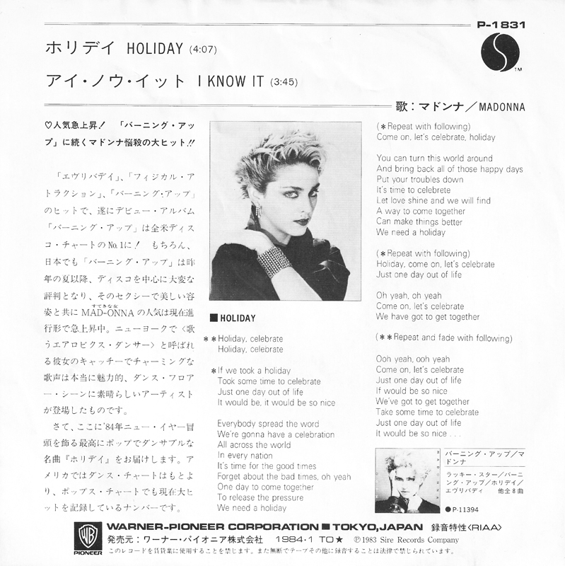 Desde entonces, «Holiday» comenzó a formar parte del repertorio de la gira promocional que Madonna seguía haciendo de su primer disco y fue editado de manera oficial en varios países del mundo. Por entonces, no se había establecido un diseño o arte de tapa oficial ya que en USA el single se había lanzado sin portada y de manera promocional, fue por esto que cada país decidió dar rienda suelta a su imaginación y realizar un diseño y arte diferente. Es así que tenemos una colección impresionante de ediciones de «Holiday» de aquellos primeros años.