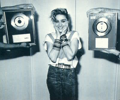 Arriba: Madonna en las oficinas de la Sire Londres, recibiendo los «Discos de Oro» y «Plata» por las ventas de «Holiday» en Sudáfrica y UK.