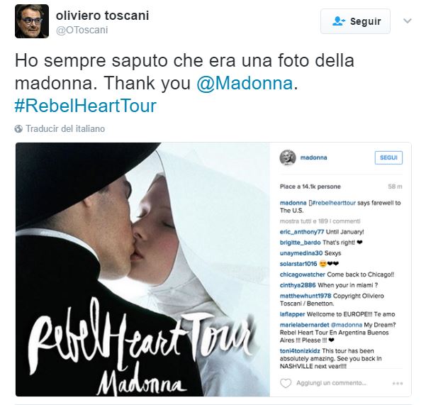 En 2015, cuando el “Rebel Heart Tour” termina su segmento americano, Madonna publica en su cuenta de Instagram y twitter una foto de Toscani de dos modelos vestidos de cura y de monja besándose en la boca, con el mensaje “Decir adiós a Estados Unidos”. A lo que Toscani responde de su cuenta personal, “Siempre supe que era una foto para Madonna. Gracias @Madonna”