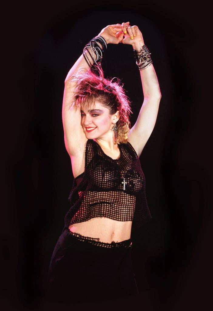 Para esta ocación, Madonna lucía botines cortos, calzas cortadas a mitad de pierna, una pollera corta de algodón y cinturones de cuero y cadenas (no, esta vez el famoso cinturón “Boy Toy” estaba ausente). En la parte superior, una camiseta de algodón cortada de manera que dejara expuesto el abdomen y su ombligo que luego se haría tan famoso como ella. Por encima de ésta, una camiseta de red (que Madonna ya había usado en varias oportunidades). Como accesorios, miles de pulseras de plástico y cadenas en ambas muñecas y guantes de encaje sin dedos. En la cabeza, sosteniendo su corta melena, un moño suelto y flojo de tela. Un par de pendientes de “estrella” remataban el estilo. Todo, absolutamente todo, en color NEGRO.