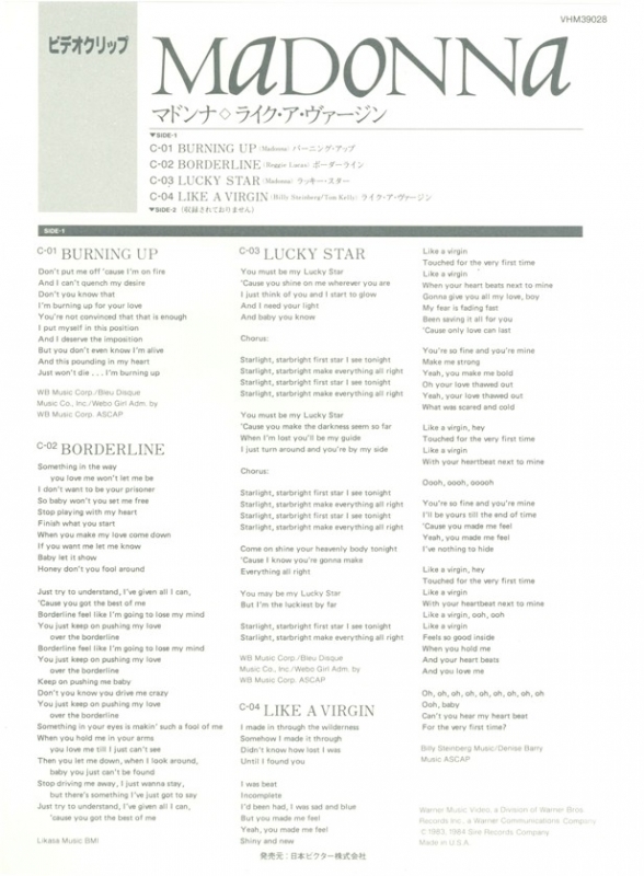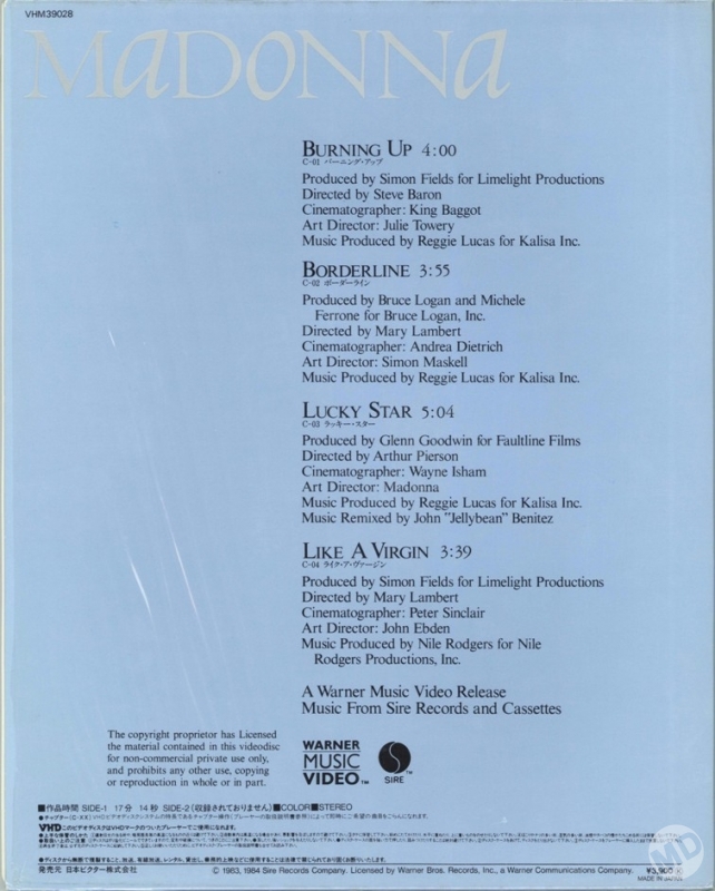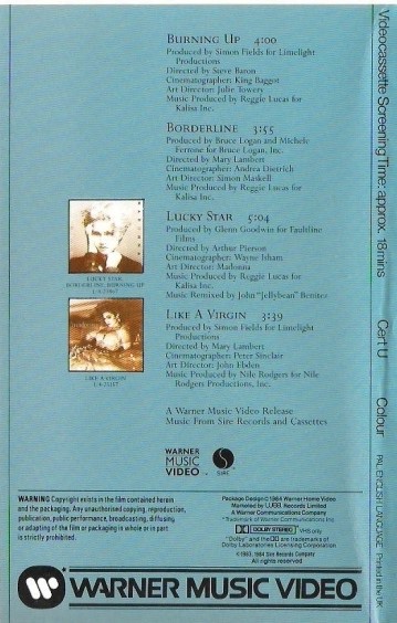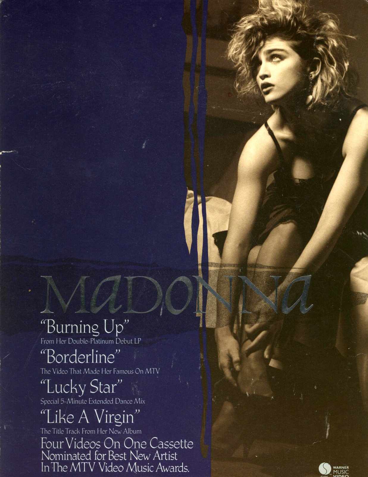 El 03 de Diciembre de 1984, la Warner Bros. y la Sire Records, deciden lanzar el primer recopilatorio en video de Madonna para promocionar los sencillos y los dos discos lanzados por la cantante. El mismo contenía los videos de “Burning up” (por primera vez en alta calidad), “Borderline”, “Lucky Star” (la versión extendida) y finalmente el recientemente estrenado “Like a Virgin” (esta es una primera versión donde se omite la escena en donde el león mueve su lengua al ritmo de la música). El video se tituló simplemente “Madonna” y para su portada se escogió una fotografía de Steven Meisel para el disco “Like a Virgin”.
