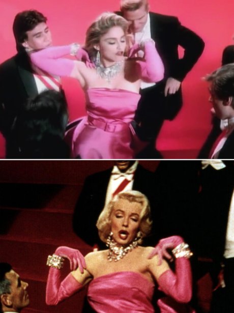 - El video musical para “Material Girl” está inspirado en uno de los íconos de la pantalla de Hollywood: Marilyn Monroe; y representa a la perfección la escena del musical “Diamonds Are a Girl’s Best Friends” (“Los Diamantes son los Mejores Amigos de una Chica”) del film de 1953 “Gentlemen Prefer Blondes” (“Los Caballeros las prefieren Rubias”) protagonizado por la platinada diva.