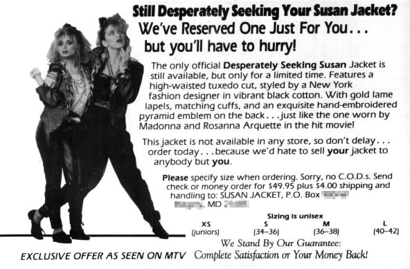 Luego del estreno del film, se realizaron copias de la chaqueta para ser vendía por encargo. Las réplicas oficiales de la chaqueta «Buscando a Susan Desesperadamente» fueron encargadas por «Orion Pictures» en colaboración con la agencia de Madonna. La empresa que las produjo se llamó «Creative Embroidery Corp.» y su comercialización corrió a cargo de «Targeted Communications». Se pusieron a la venta, principalmente en Estados Unidos y Canadá, durante un breve periodo, poco después del estreno de la película en 1985 y durante los primeros meses de 1986. MTV también organizó un concurso para ganar algunas chaquetas y permitió a los espectadores llamar y hacer un pedido por tiempo limitado.