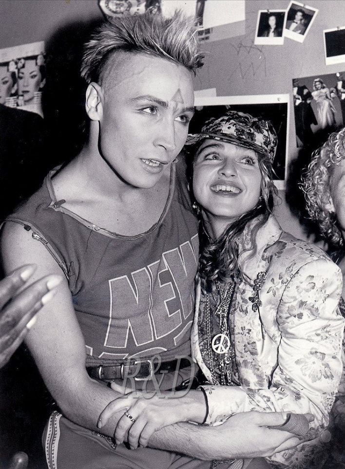 Peter Robinson, fue un artista y compositor jamaiquino-británico que ingresó al mundo del espectáculo a principios de los 80s. Luego de que Boy George lograra un gran éxito comercial con su banda Culture Club, las disqueras británicas estaban buscando artistas con un estilo parecido (andrógino y travestido). Luego de llamar bastante la atención por su participación en el video “Who’s that Girl?” de Eurythmics, Robinson firma contrato con Phonogram Rercords con su nuevo nombre artístico: Marilyn. El cantante tuvo un gran primer éxito en 1983 con el single “Calling Your Name” el cual alcanzó el TOP5 en UK y Australia y fue N°1 en Japón. En 1984 tuvo dos éxitos menores en el TOP40 con “Cry and Be Free” y “You Don’ Love Me”. Más tarde, a principios de 1985 y atravesando dificultades económicas, Marilyn es obligado a dejar su hogar en Londres y es trasladado por su compañía a Detroit, Michigan, para comenzar a trabajar con el productor musical Don Was (recordemos que Don Was había ya trabajado con Madonna a principios de los 80s, cuando ella grabó los coros para el tema “Shake Your Head” del grupo del productor llamado «Was Not Was»). En Junio de 1985, Marilyn lanzó su ábum debut “Despite Straight Lines” y para la ocación realiza una gran fiesta en el club “Palladium” fue en esta oportunidad que se encuentra con Madonna y se toman varias fotografías juntos. Probablemente, esa noche fue el mismo día en que Madonna realiza la sesión fotográfica para la revista “Time” tomada por Francesco Scavullo, ya que ella lucía el saco diseñado por Prince que se utilizó para dicha sesión. A partir de 1985, el éxito de Marilyn nunca despegó, su adicción a las drogas y sus mediáticas peleas con Boy George comenzaron a desgastar su imagen y su carrera se desmoronó.