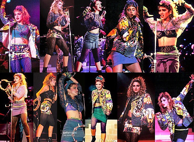 El primer segmento del show estaba caracterizado por mucho color, energía y estridencia. Stewart estaba convencida de que cada color tiene un significado y proporciona una energía diferente. Madonna lució mucho color y en combinaciones exóticas y estrafalarias que incluía no solo la ropa sino también calzados, accesorios y maquillaje. Se hicieron varias prendas iguales (al menos tres de cada una) para evitar posibles demoras por daños, pérdidas o alteraciones en la ropa durante la gira. En el primer segmento del show Madonna tenía un atuendo básico que consistía en botas cortas, medias de encaje y una minifalda muy corta sostenida por un fino cinturón de cuero sintético de varios colores y tachas. Un top de encaje violeta por el que se mostraba sugerentemente el corpiño y sobre esto una chaqueta de tela jean estampada con un diseño psicodélico. Algunas noches Madonna decidía realizar cambios en su vestuario ya sea modificando el color de su pollera (de la que podemos reconocer de varios colores: violeta, una verde, una negra, azul y otra estampada en combinacón con la chaqueta). El top también variaba en ocasiones, de esta prenda se reconocen dos versiones (una color lavanda usada en casi la totalidad de los shows y otro negro de lentejuelas con breteles que Madonna usó en Filadelfia). El color de los accesorios como la banda del cabello también variaba de show en show.