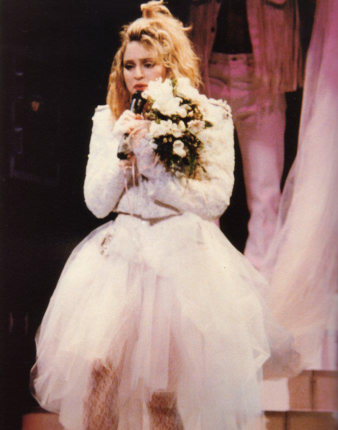 En la última parte del show, vemos dos atuendos diferentes, el primero consiste en una versión de un traje de novia, en donde Madonna lucía un top corto blanco (idéntico al top negro anterior con la cruz calada), un saco corto estilo esmoquin bordado en lentejuelas y una gran falda vaporosa compuesta por varias capas de tul; acompañaban este estilo una gran broche de brillantes en forma de cruz adherido a la cintura y un largo velo de tul. Para la última canción, Madonna lució una pollera tuvo blanca hasta por debajo de las rodillas con una tela con textura similar a un brocato; un top blanco bordado con canutillos y lentejuelas blancas y una estola de piel falsa; debajo de la falda medias de encaje blanco y botas cortas del mismo color.