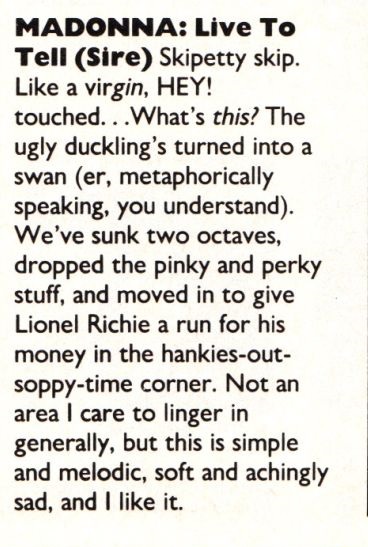 - Si bien, Madonna había grabado baladas previamente, con “Live to Tell” seria la segunda vez que la cantante lograra posicionarse en los primeros lugares de los rankings e ingresar en los charts de Adultos. Recordemos que la primera vez fue con “Crazy for You” tema principal del film “Vision Quest” de 1985.