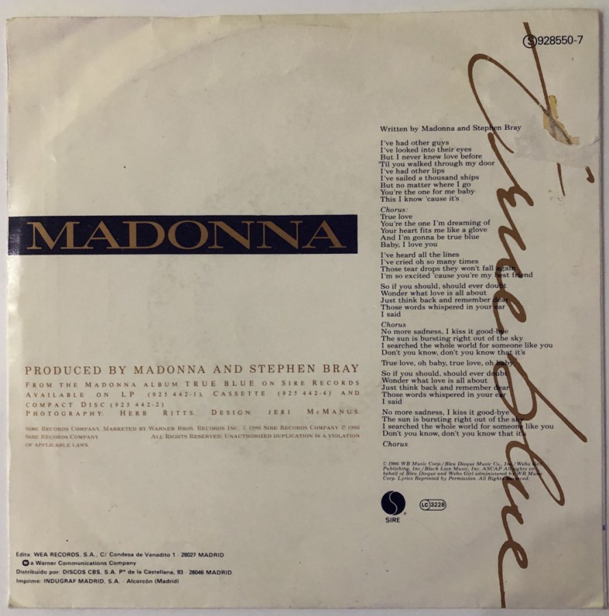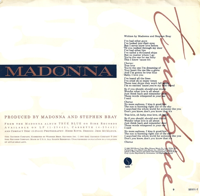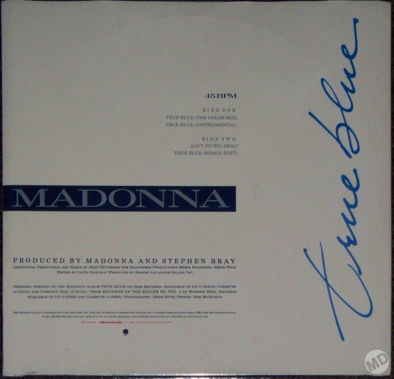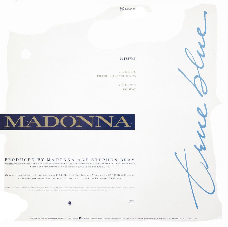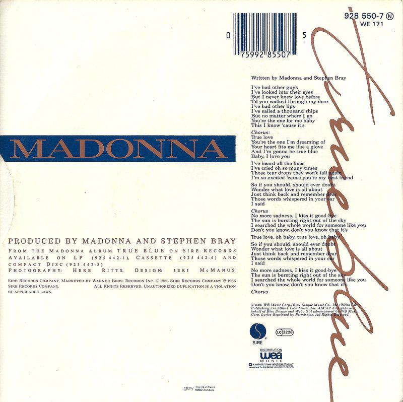 - “True Blue” fue el tercer sencillo extraído del disco del mismo nombre, y lanzado el 29 de septiembre de 1986 a nivel mundial y el 09 de octubre de 1986 en USA.