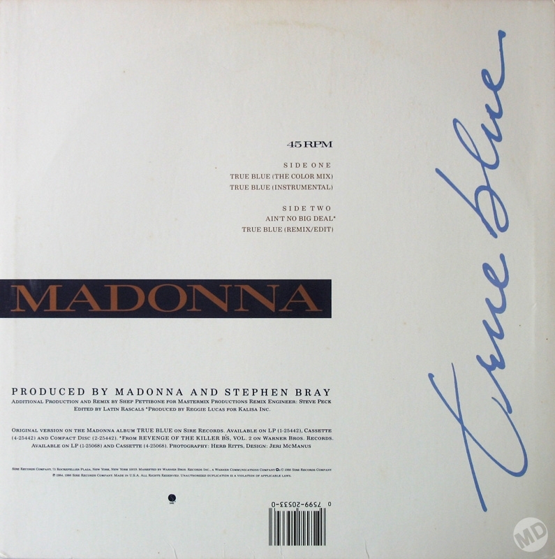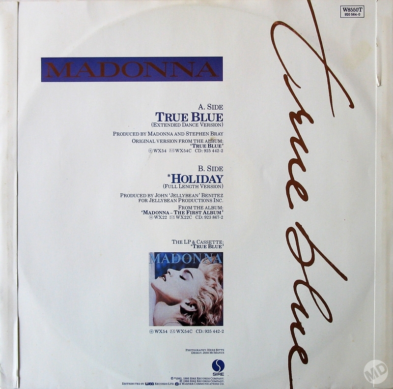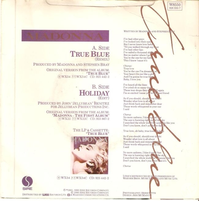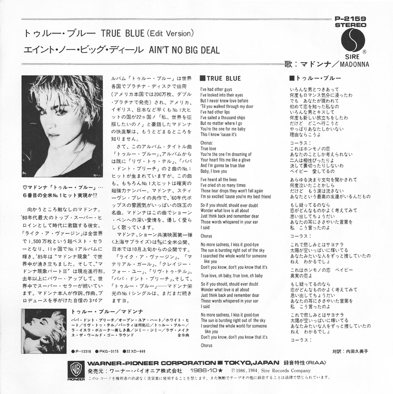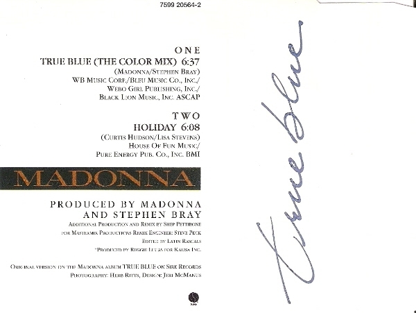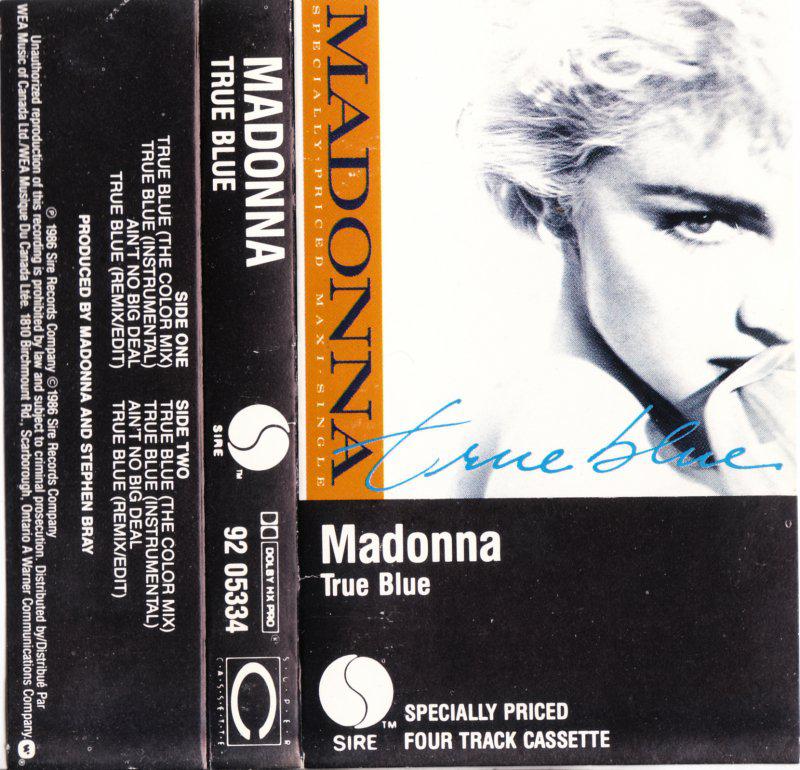 - “True Blue” fue el tercer sencillo extraído del disco del mismo nombre, y lanzado el 29 de septiembre de 1986 a nivel mundial y el 09 de octubre de 1986 en USA.