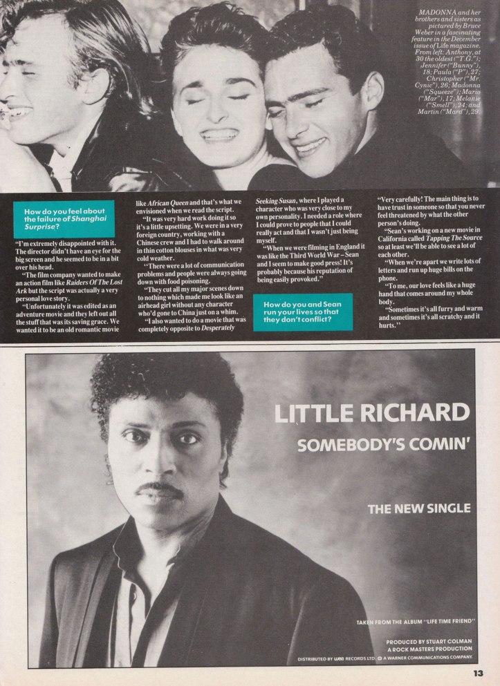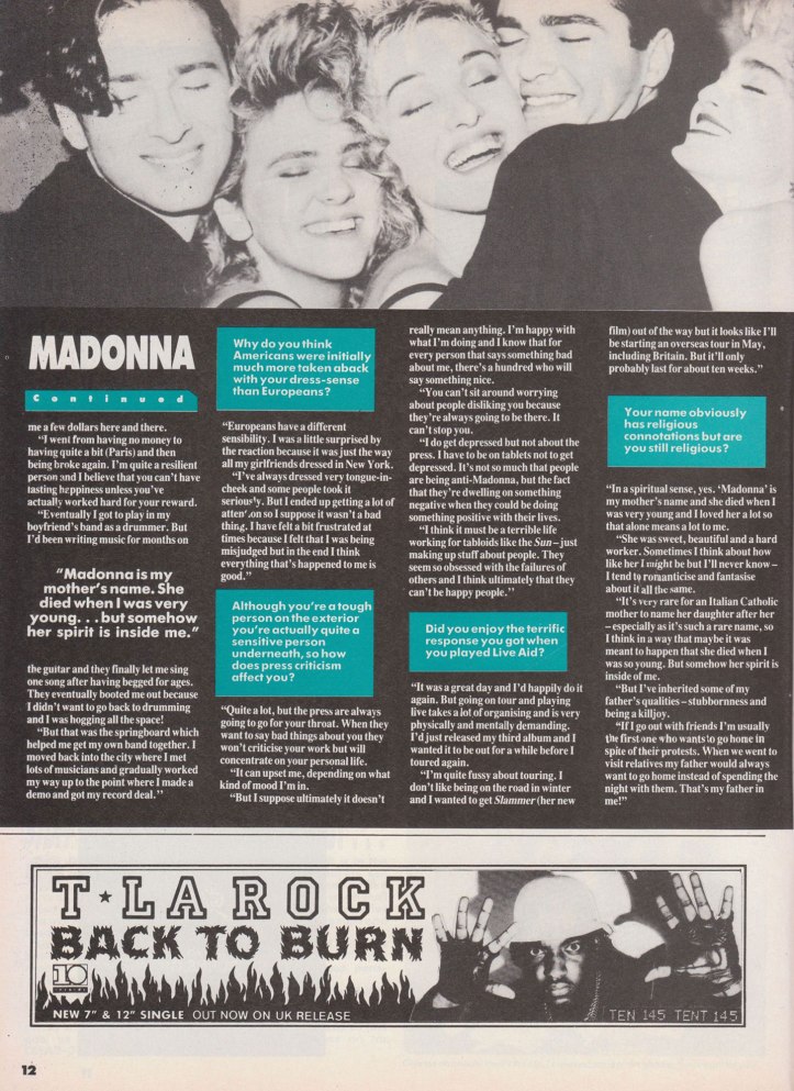 La nota consistían en una entrevista titulada «Madonna Opens her Heart» («Madonna abre su corazón») y fue realizada por el reportero Simon Bates para Radio 1. En la misma, Madonna habla de sus comienzos, de la estricta vida que su padre la hacía vivir, de cómo fue llegar a New York para alcanzar sus sueños. Además al final, Madonna brinda una opinión bastante interesante de cual cree ella que fue el motivo del fracaso de anterior película «Shanghai Surprise». Madonna volvería a aparecer en la portada de esta publicación en octubre de 1987