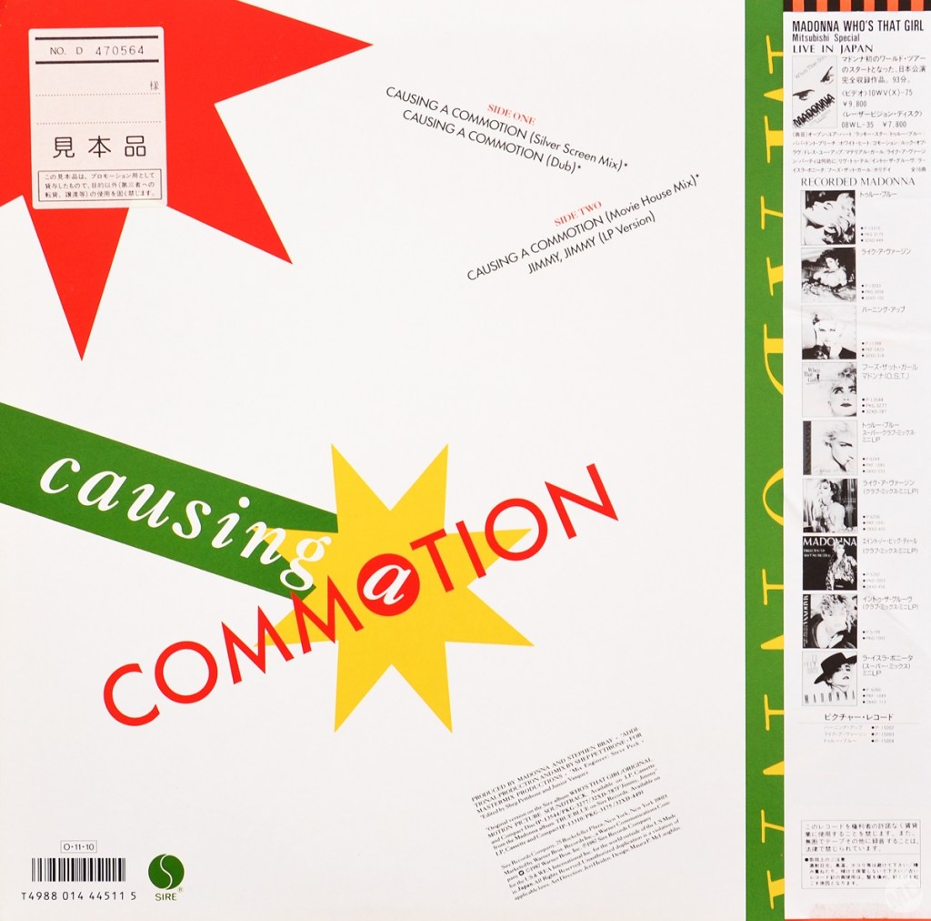 - “Causing a Commotion” es una canción dance, con un ritmo mucho más bailable que el tema “Who’s That Girl” (primer sencillo del soundtrack) y podría ser comparada con “Into the Groove”, otro gran éxito, también compuesto por Stephen Bray, quien se encargó de la producción integral; con mezclas y edición adicional a cargo de quienes más adelante serían dos de los colaboradores más famosos de Madonna durante los 90s: Shep Pettibone y Junior Vasquez. Los coros estuvieron cargo de Niki Naris y Donna DeLory.
