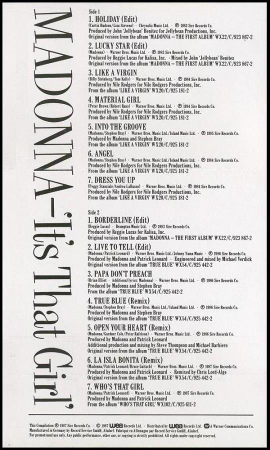 En 1987 la Sire UK estaba tan complacida con el éxito que Madonna tenía con la serie de conciertos del “Who’s That Girl Tour” en dicho país, los cuales se presentaron totalmente agotados, que decidieron lanzar un pequeño recuerdo para celebrarlo. Una increíble compilación de los más grandes éxitos de Madonna hasta el momento en formato de VHS y Casette. El producto fue realizado en Alemania de manera exclusiva para el mercado de Inglaterra, en un limitadísimo número de 500 unidades de cada formato para ser repartida entre gente de la prensa y aquellos involucrados en los shows realizados en el país británico. La compilación se tituló graciosamente “It’s That Girl” (“Esto es esa chica”) para jugar con el título de la gira, el disco y la película que preguntaba insistentemente “Who’s That Girl” (“Quien es esa chica”). Para el diseño de portada se utilizó una imagen del portfolio de Herb Ritts tomado en 1986 para la campaña Mitsubishi. En la misma, vemos a Madonna con el ya conocido traje de torero que luego se haría famoso en la cubierta del disco “You Can Dance” lanzado a fines de 1987. El contenido de esta compilación consistía en prácticamente todos los singles editados en UK desde 1983 hasta 1987, con excepción de aquellos editados por el sello Geffen Records, de manera que “Crazy for You” y “Gambler” quedaron afuera. El primero de los singles que se tomó en cuenta fue «Holiday», ya que si bien «Everybody» fue lanzado oficialmente en 1982, no tuvo prácticamente éxito y el segundo single «Burning Up», no se editó en UK; de manera que «Holiday» prácticamente es considerado como el primer sencillo de Madonna de manufactura inglesa. Esta compilación fue de uso estrictamente promocional como lo reza en su portada, por lo que en la actualidad se ha convertido en uno de los items más buscados y solicitados por los coleccionistas.