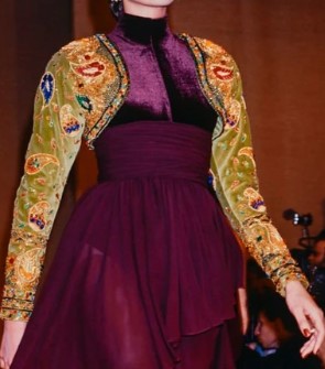 - Chaqueta bolero de terciopelo con incrustaciones de imitación de diamantes, piedras, cuentas y lentejuelas de la colección «Redy to Wear» otoño-invierno 1988 de Christian Lacroix.