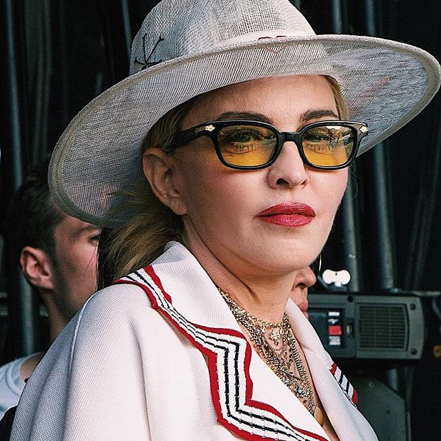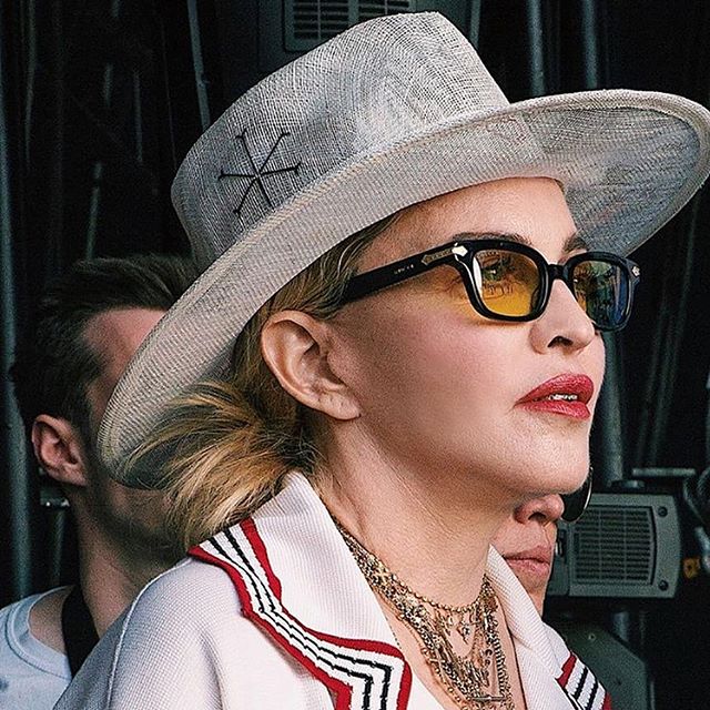 Madonna se presentó vestida de pies a cabeza de su marca preferida «Gucci» @Gucci. Lució un traje tipo pijama con chaqueta abotonada al frente, mangas tres cuartos y pantalón con piernas debajo de las rodillas. La confección está realizada en seda color natural con decoración de tiras en color rojo y azul en los puños, solapas y bolsillos. Los lentes en acetato y con cristales ahumados en color amarillo eran de la misma marca. El sombrero es de la marca Ruslan Baginskiy @ruslanbaginskiy_hats (de la que Madonna ya posee varias piezas) y en cuanto a las joyas, la cantante lució en su mano izquierda los anillos «MDNA» de la marca «Kismet» @kismetbymilka y en su mano derecha anillos de @Yeprem.