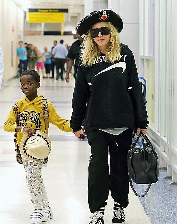 Madonna vestida de manera muy relajada, como es habitual cada vez que viaja, lucía unos pantalones deportivos «Dolce & Gabanna»; un buzo negro de la marca «Manhattan Knights», su sombrero «Beautiful Game» realizado especialmente para ella por la marca «Ruslan Baginskiy Hats» y sus ya preferidas gafas de sol marca «Porsche».