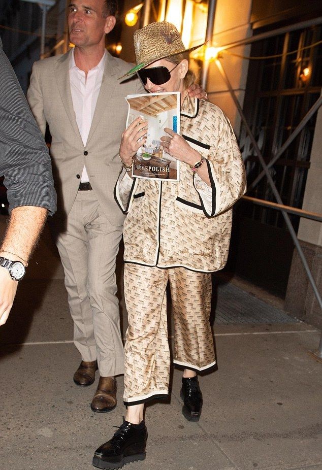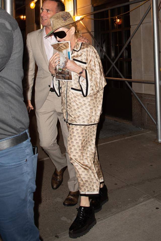 Madonna fue vista saliendo de un edificios de oficinas en Manhattan, el martes 31 de julio de 2018. La cantante lucía un atuendo con varias prendas repetidas y que aparentemente serían sus preferidas. Un equipo «Gucci» de seda estilo pijama de pantalón y camisola en color beige con estampado con el logo de la marca (este atuendo lo habría usado en repetidas oportunidades en los últimos meses); sus gafas de sol «Porsche» y las zapatillas negras con plataforma de goma y calado de estrella, diseño de su amiga Stella Mc Cartney; además la cantante lucía un sombrero de mimbre.