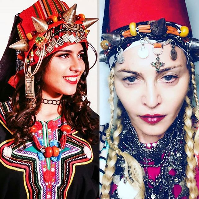 Madonna reflejaba el estilo de la cultura Amazigh (Imazighen en plural, que significa “gente libre”) mujeres de que habitan la zonas de Marruecos, Argelia, Túnez, Libia, Mauritania, Sahara Occidental, Islas Canarias, así como también algunas partes de Mali, Egipto y Níger. Generalmente se les dice “Bereberes”, pero muchos Imazighen consideran este término como despectivo ya que es una nomenclatura del S.XIX derivada de la palabra griega «barbaria», que significa bárbaros. Este tipo de atuendo se regala a las mujeres previa a la boda para darles bendiciones, fertilidad y protegerlas contra el mal de ojo, además para determinar el estatus social del matrimonio. Los colores, la vincha, las gemas, los cuernos y la plata se relacionan con la “fertilidad y la femineidad”. En cuanto a Madonna adoptando ese estilo, especialistas han explicado que ella no está usando un traje tradicional. Las piezas que usa son «una amalgama de estilos de diferentes partes del suroeste de Marruecos», sus trenzas son muy comunes en el área de Guelmim, al sur de Marruecos, y al menos uno de sus brazaletes es de joyería de perlas sudafricanas. Además, Madonna está usando «cruces cristianas alrededor del cuello, lo cual es algo atípico en la joyería Berebere, ya que los Bereberes son en su mayoría musulmanes». Se pudo ver también unos increíbles pendientes de diamantes marrones y platino de Henri Sillam y piezas de Lana Jewerly, como su típico y conocido colgante “Mambo”. Madonna completó su atuendo con unos impresionantes zapatos de tacón rojo en seda con un gran aplique de joyas en los costados y medias de red. Hay que destacar que el tocado que Madonna usó para la entrega de los MTV ya lo había estrenado días previos durante su celebración de cumpleaños en Marruecos.