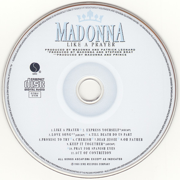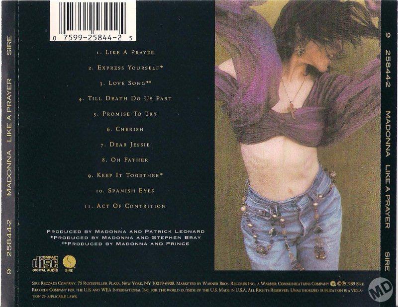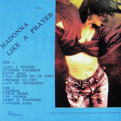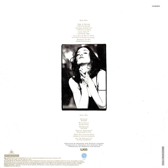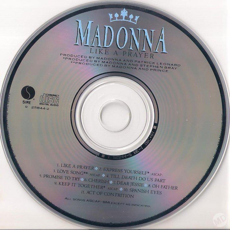 01 – «LIKE A PRAYER» (05:41): la primera canción escrita y grabada para el álbum, «Like A Prayer», dicta la dirección de todo el disco. Fue lanzada como single el 03 de Marzo de 1989 y llegó al puesto N°01 del Billboard HOT100. Con los versos reducidos a una producción casi acappella, el contraste del coro de gospel a cargo del «The Andrae Crouch Gospel Choir» es realmente edificante. La canción tiene un doble sentido en cuanto a su letra en donde Madonna compara el éxtasis religioso con el sexual lo que destacó una polémica que causó que el director del coro Andare Crouch decidiera no participar en el video. Aunque Patrick Leonard se horrorizó inicialmente porque Madonna escribió el coro alusivo a la felación y le pidió que lo cambiara, ella se negó, y el doble sentido de la canción pasó desapercibido debido a la controversia generada por el video. En la versión original la canción se inicia con un solo de guitarra de Prince y además el ex miembro de Icehouse y bajista de Pink Floyd, Guy Pratt, también participó tocando el bajo en varias canciones y en la canción principal «Like A Prayer»: «estoy en la mezcla original y en la versión del álbum y en la versión que estaba en el video». La versión de «Like A Prayer» presentada en el set de éxitos de 1990 «The Immaculate Collection» es un remix realizado por Shep Pettibone para incluir la tecnología QSpound y elimina la introducción de guitarra de Prince y en su lugar comienza con Madonna preguntando: «¿Dios?». La guitarra de Prince fue reinstalada en la colección de éxitos de seguimiento «Celebration» en 2009. Su videoclip está dirigido por Mary Lambert y causó una gran controversia debido a sus imágenes que vinculaban el erotismo y la religión. La canción debutó en vivo durante «The Blond Ambition Tour» (1990) y en la actualidad se ha convertido en una de las canciones preferidas de Madonna, las últimas interpretaciones fueron durante el concurso «Eurovision» y el «The Madame X Tour» (2019).
