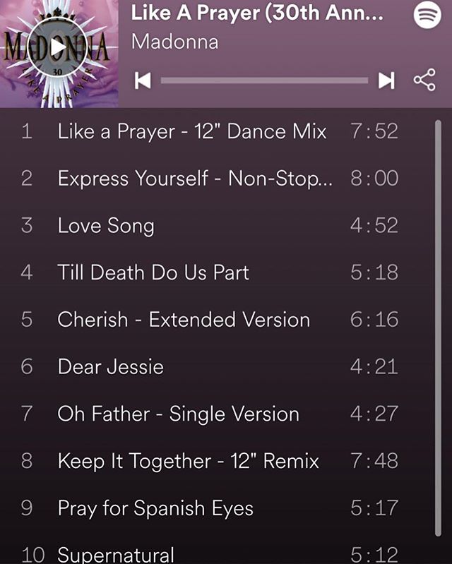 - Además, para celebrar el 30° aniversario del disco, Warner Music decidió lanzar una edición especial en las plataformas de streaming más importantes como Apple Music, Spotify, Amazon Music, Pandora y Deezer. No era una re-edición de la versión original del álbum sino que consistía en una recopilación especial para la ocasión. Madonna lo compartió en sus redes: «Fans! Para celebrar el 30° aniversario del disco ‘Like a Prayer’ estamos felices de compartir una dedicada playlist que incluyen algunas de las canciones originales del disco, remixes y más… Veánlo!«. Esta extraña edición especial contiene 10 tracks: cuatro remixes en lugar de las versiones originales de los temas «Like a Prayer» (12″ Dance Mix), «Express Yourself» (Non Stop Express Mix), «Cherish» (Extended Version) y «Keep it Together» (12″ Mix). Una versión single (que es diferente a la incluída en el disco) «Oh Father» (Single version) y además se incluyó la canción inédita y cara B de «Cherish», «Supernatural». El resto de las canciones: «Love Song», «Till Death Do Us Part», «Dear Jessie» y «Pray for Spanish Eyes» permanecieron en sus versiones originales. Sin embargo,«Promise to Try» y «Act of Contriction» fueron excluídas de la lista.