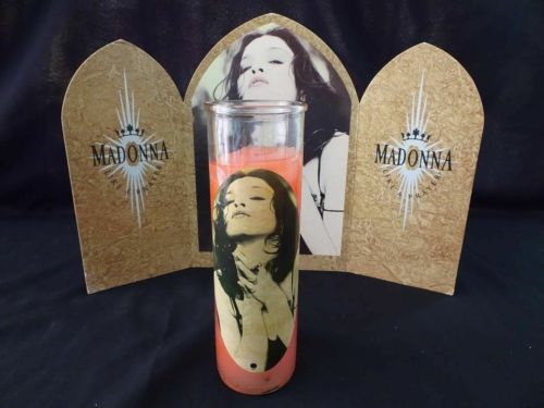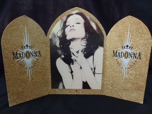 - Otro artículo que también se ha convertido en el preferido de coleccionistas, es el «Altar« que fuera realizado por la SIRE para colocar en tiendas y vidrieras para promoción. El set consiste en un triplico de cartón en forma de altar católico, en el centro, una imagen de Madonna tomada por Herb Ritts (la misma que la usada para el single), el material tiene un color dorado brillante y se acompaña de un velón rosa perfumado con «patchouli» en un frasco de vidrio, se acompaña de una decoración al estilo. Este set es más fácil de encontrar y actualmente se vende en Internet a diferentes valores.