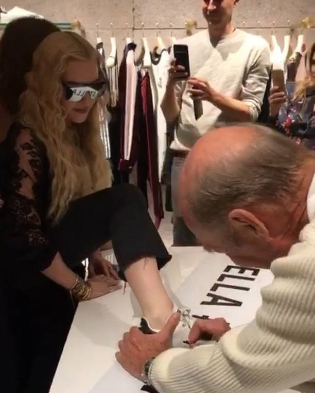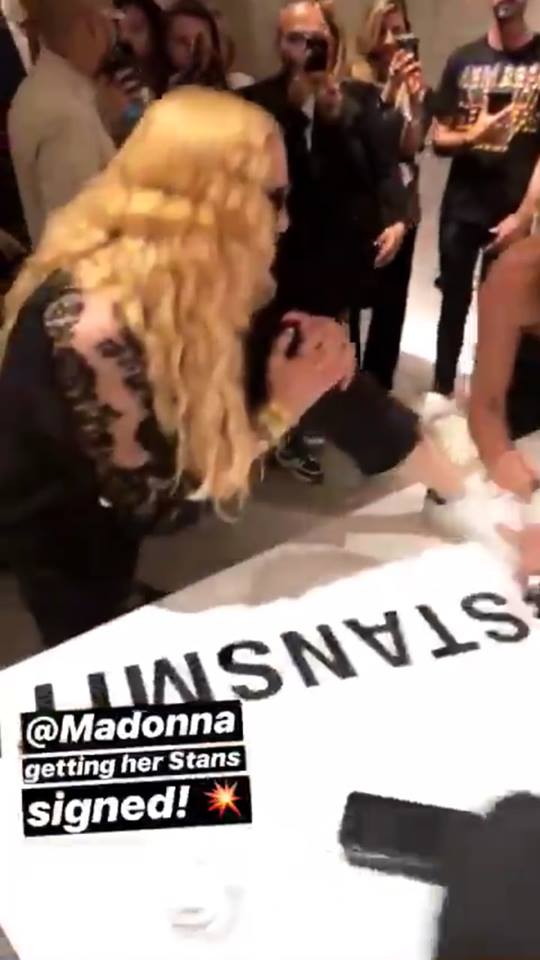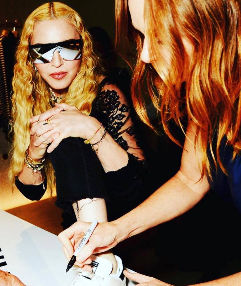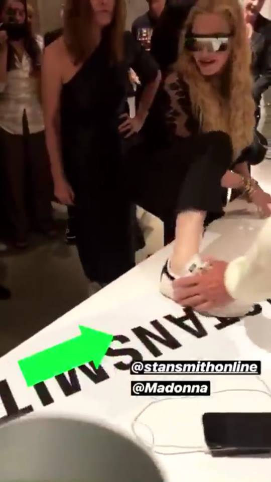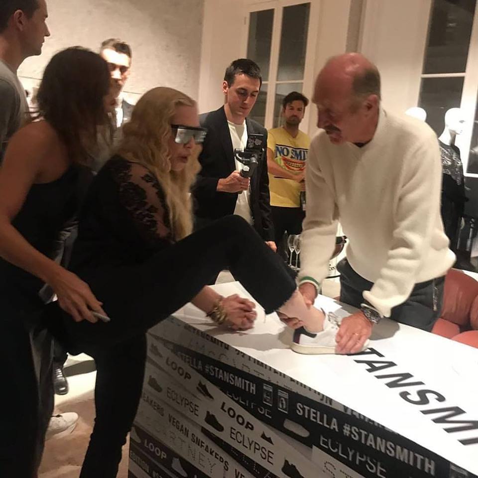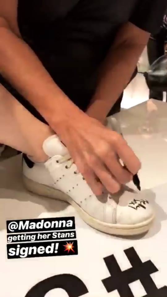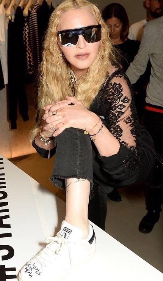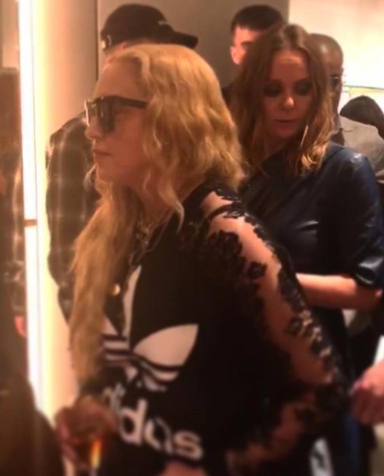 Madonna viajó nuevamente a Londres para participar de la “London Fashion Week” a realizarse entre el 14 y 18 de septiembre. El lunes 17, la Reina del Pop asistió a la presentación de la nueva línea de calzados deportivos para la marca Adidas a cargo de su amiga, la diseñadora Stella Mc Cartney y Stan Smith. Madonna lució un abrigo deportivo negro de la marca, lentes oscuros, pantalones negros y una camiseta de encaje. Durante el evento, la cantante se acercó a los diseñadores y con mucha energía puso su pie sobre la mesa para que los creadores de la zapatilla le firmaran el calzado. Además de posar para las cámaras junto a Stan Smith y Stella Mc Cartney, Madonna se mostró muy animada bebiendo champagne rosé (su preferido) con Zoe Manzi, editora de la revista “M.O” (“Mondiaal Nieuws”) y el fotógrafo Richard Young.
