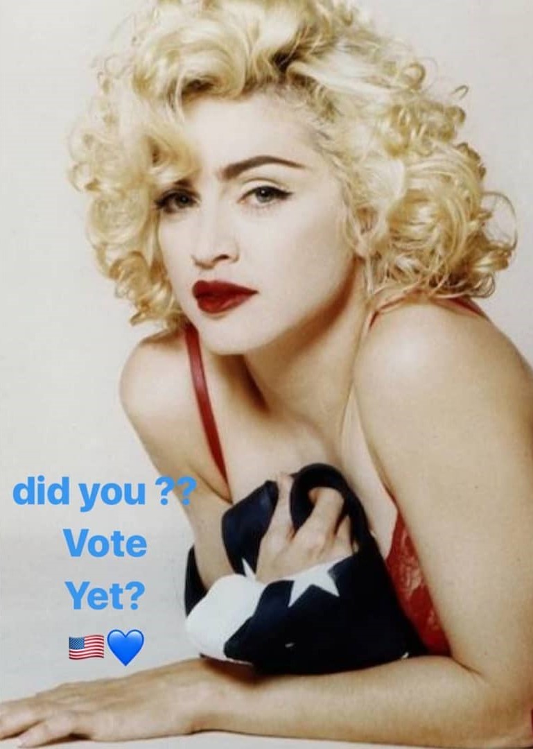 El 06 de noviembre se llevaron a cabo las elecciones en el Senado de los Estados Unidos y por supuesto Madonna no ha podido quedar fuera de este acontecimiento. Reconocida como una gran enemiga de Donald Trump y su gobierno, Madonna ha salido a apoyar al partido Demócrata en las redes sociales. El mismo día de las elecciones, Madonna subió a su cuenta oficial la campaña publicitaria «Rock The Vote» que realizaría en 1990 alentándo a los jóvenes que se unieran y registraran para votar en las elecciones. Haciendo un juego de palabras con una frase de su tema «Vogue»: «Strike a pose, there’s nothing to it VOTE!». Además subió varias fotos de este comercial como Instagram Stories con los textos «¿Ya has votado?».