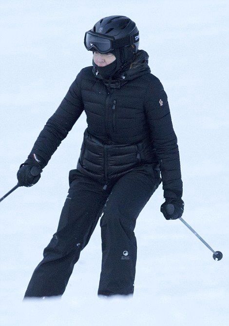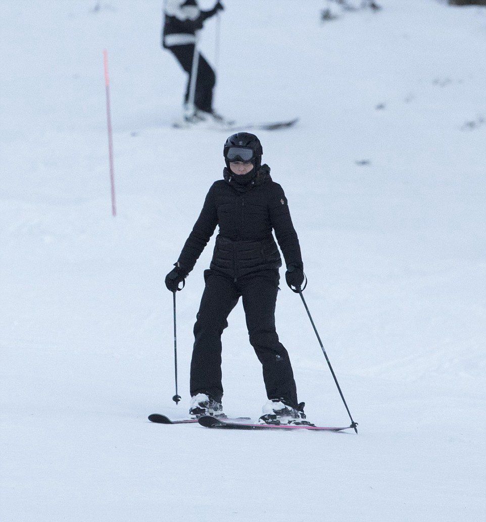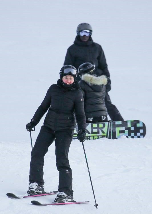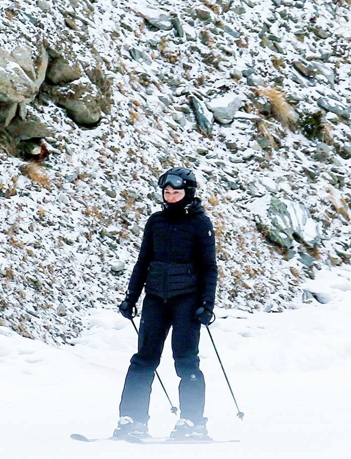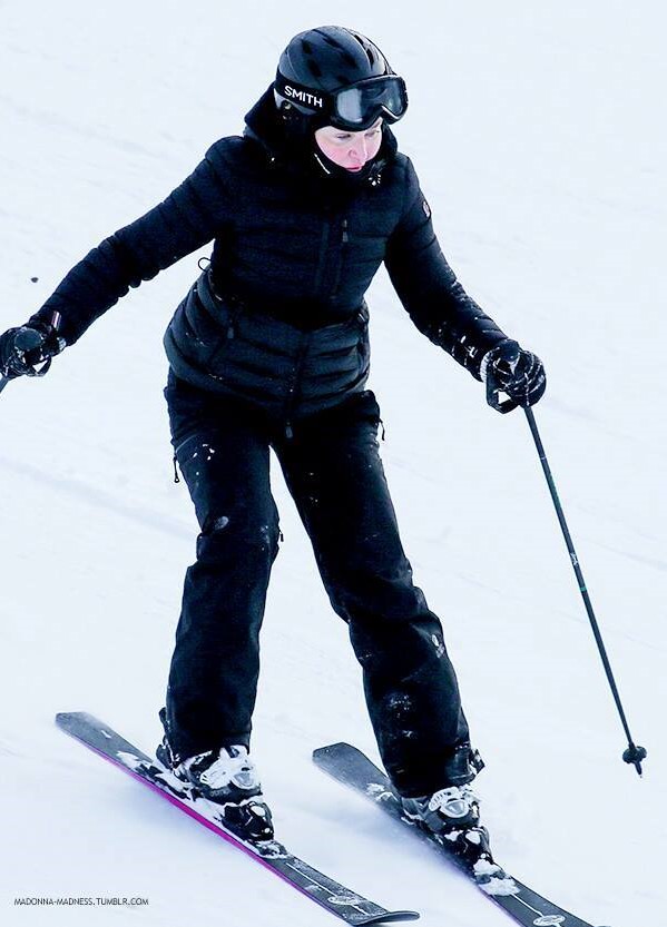 Durante su corto período de ski en Vernier, Madonna lució un abrigo negro con faja ajustable y hebilla de la marca Moncle Grenoble.