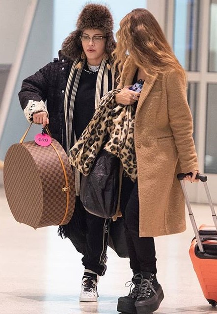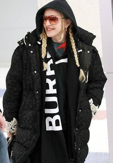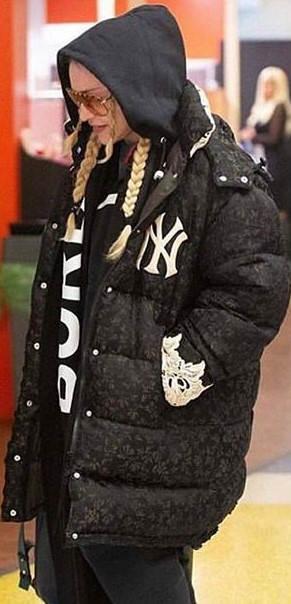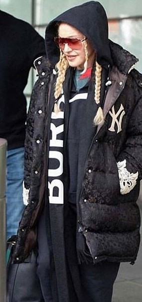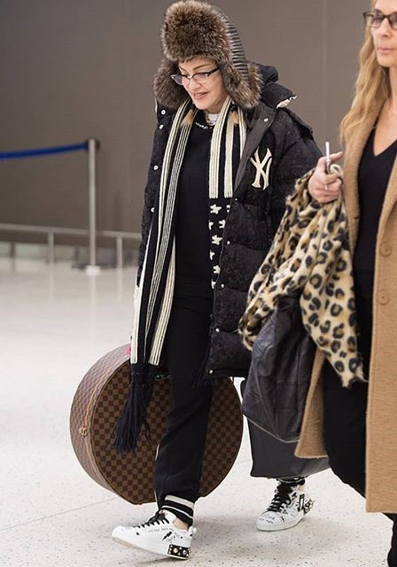 Madonna lucía la chaqueta extragrande de “Gucci” con el logo de los New York Yankees, que ya había usado en varias ocasiones el año pasado. El abrigo se puede conseguir por U$S 5500. Además usó su bufanda con rayas y estrellas que por lo que vemos es su favorita desde el 2016. Acompañando el conjunto, volvió a utilizar el buzo con capucha de la diseñadora bloggera Chiara Ferragni, que al parecer ya es una de sus prendas preferidas sobre todo para viajar.