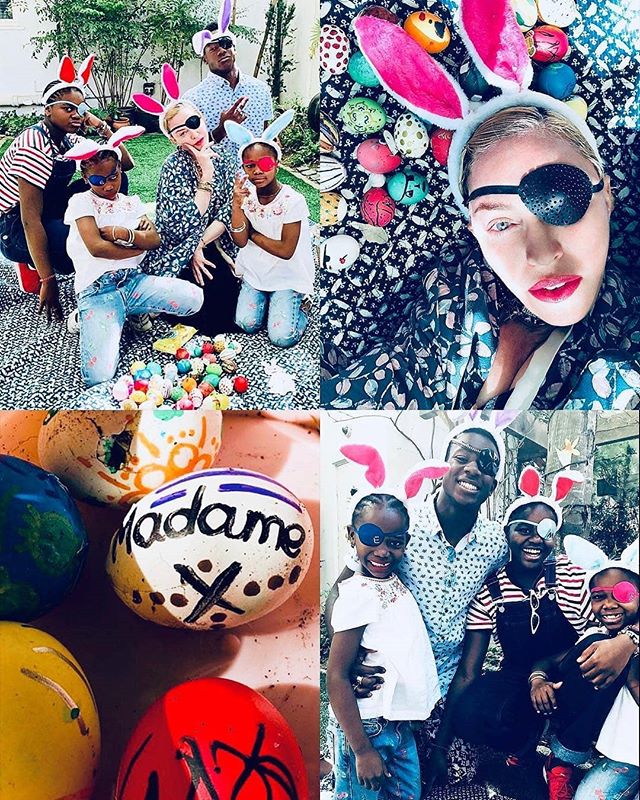 El domingo 21 de Abril, Madonna subió a las redes un collage de varias fotos en donde la vemos festejando las Pascuas junto a sus cuatro hijos. En la foto, Madonna aparece con el parche en el ojo que ya se ha hecho famoso luego del inicio de la nueva era promocional de su próximo disco «Madame X». También vemos a sus hijos David Banda, Mercy James y las gemelas Estere y Stella. Los niños también lucen sus respectivos parches en el ojo y además todos portan orejas de conejo. Madonna escribió: «Madame X es madre».