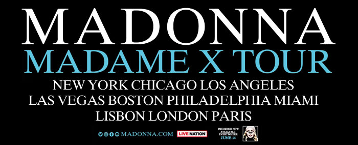 El anuncio oficial dice: Luego de su increíble performance en los Billboard Music Awards y del anuncio de su ya muy anticipado nuevo disco «Madame X», que estará disponible a nivel mundial el 14 de Junio, Madonna, Live Nation y Maverick han anunciado una serie de raras e íntimas actuaciones que se llevarán a cabo de manera exclusiva en teatros, dándole a los fans la oportunidad de ver a Madonna en un ambiente como nunca antes la vieron y con un número mayor de actuaciones en cada ciudad. El «Madame X Tour» comenzará el 12 de Septiembre en el BAM Howard Gilman Opera House en New York, luego habrá actuaciones en el Chicago Theatre, The Wiltern en Los Angeles, The Colosseum en el Caesars Palace de Las Vegas, The Boch Center Wang Theatre en Boston, The Met Philadephia y The Filmore Miami Beach en el Jackie Gleason Theatre. La gira finalizará aproximadamente a principios de 2020 en Europa con presentaciones en el Coliseum de Lisboa, el Palladium de Londres y el Gran Rex de París. Arthur Fogel, promotor de Madonna de mucho tiempo y presidente de Global Touring, Global Music y Live Nation dijo: «la oportunidad que tienen los fans de ver a Madonna en estos lugares es increíblemente especial. Estamos orgullosos y entusiasmados de poder llevar esta oportunidad a todos los fans».