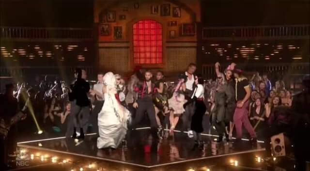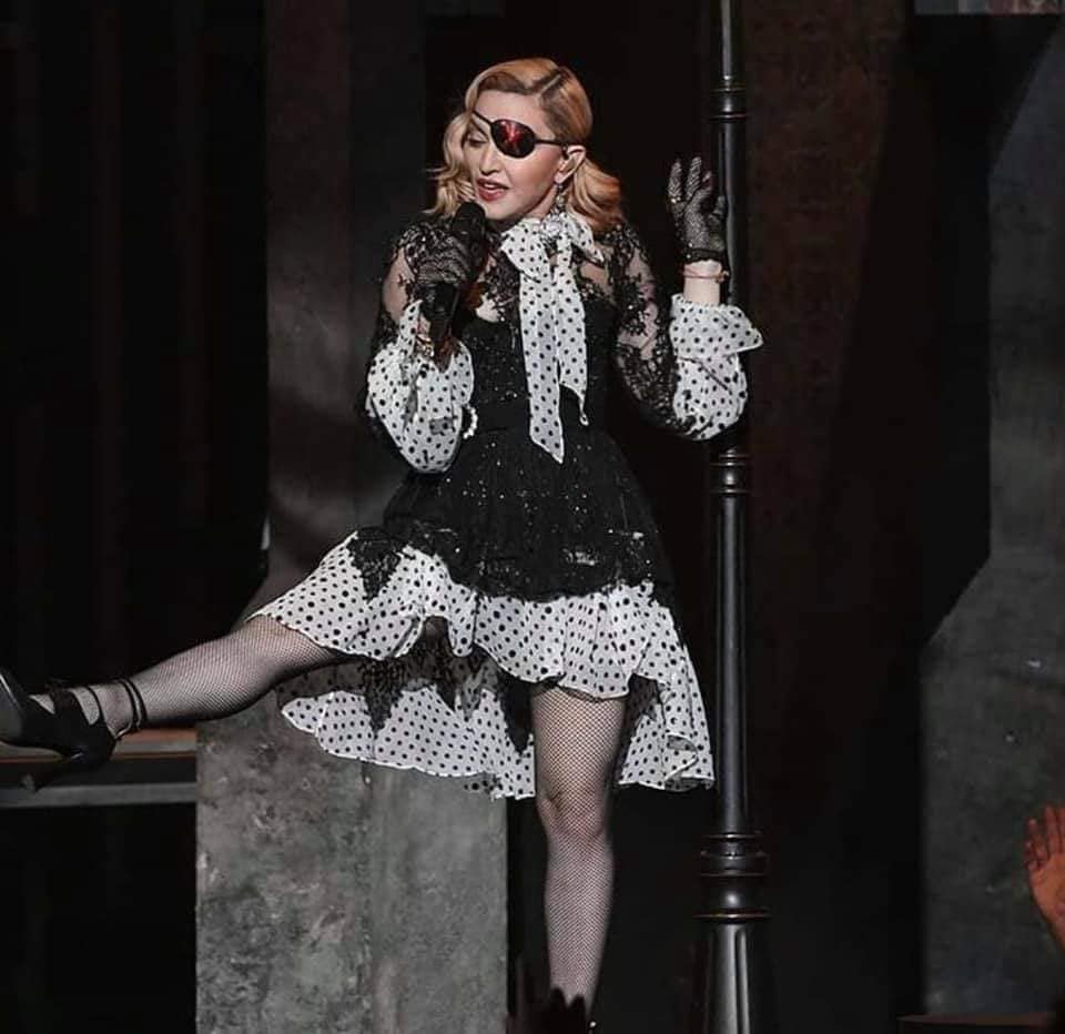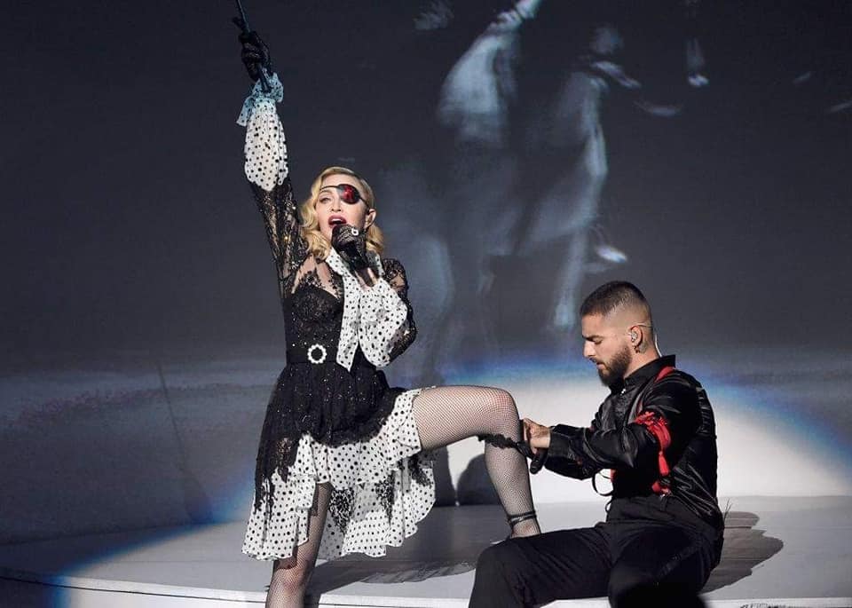 Luego de la transmisión grabada de Ariana Grande, probablemente para dar tiempo a preparar el escenario, promediando la noche Madonna hizo su gran presentación interpretando «Medellín». Con una actuación innovadora y usando altísima tecnología con realidad virtual y aumentada, Madonna y todo el grupo, pudo cantar y bailar junto a varios hologramas de ella misma los cuales se vieron por las pantallas gigantes y por supuesto en la transmisión en vivo. Madonna comienza a cantar sobre una tarima mientras como su nuevo alter ego, Madame X, con un vestido corto negro con lunares y volados, pañuelo al cuello y el ya típico parche en el ojo, Madonna comienza a interactuar con otros de los personajes de sus videos. Cuatro fueron los hologramas que se proyectaron durante el show. Dos ya los conocíamos ya que fueron personajes que aparecieron en el video «Medellín»: la profesora de cha cha cha y la novia; los otros dos, vendrán más adelante seguramente y eran una espía y una música. Luego Madonna se une a Maluma, quien también tuvo su momento en solitario y ambos realizan una coreografía bastante tranquila y cuidada. Ocuparon la totalidad de los tres grandes escenarios, dos centrales y un periférico. La escenografía también móvil cambiaba continuamente para dar paso desde una calle en Medellín hasta una cantina al mejor estilo pirata con Madonna y sus hologramas bailando sobre las mesas. Para el final, Madonna, Maluma y todos los bailarines bailan entre el público para dirigirse al escenario periférico y finalizar la actuación.