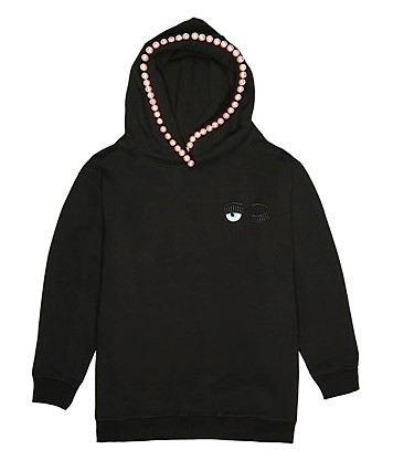 Los atuendos de Madonna: abrigo deportivo negro con incrustaciones en la capucha de Chiara Ferragni. Pantalón deportivo negro de algodón con elástico en la cintura y vivos laterales blancos de la marca «Dolce & Gabbana». Abrigo extragrande de plumas con detalle de puntillas en cuello y puños, logo de los NY Yankees de la marca «Gucci».