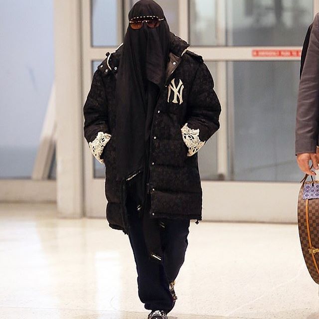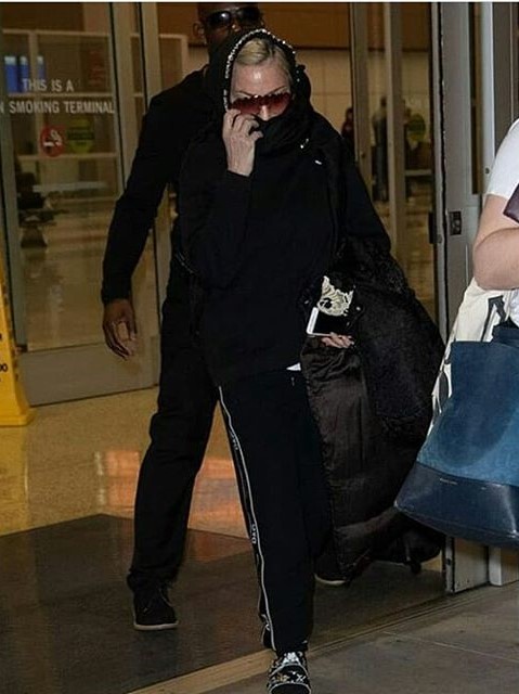 Posteriormente, el martes 07 de Mayo, Madonna fue vista nuevamente en otro aeropuerto. Esta vez en el Aeropuerto Internacional «JFK» de New York probablemente rumbo a Londres. Lucía su abrigo extragrande «Gucci» con el logo de los NY Yankees y las gafas de siempre. Aparentemente no estaba de humor para fotos así que decidió cubrirse por completo el rostro con una burka. Luego se la vió pasar los controles de seguridad.