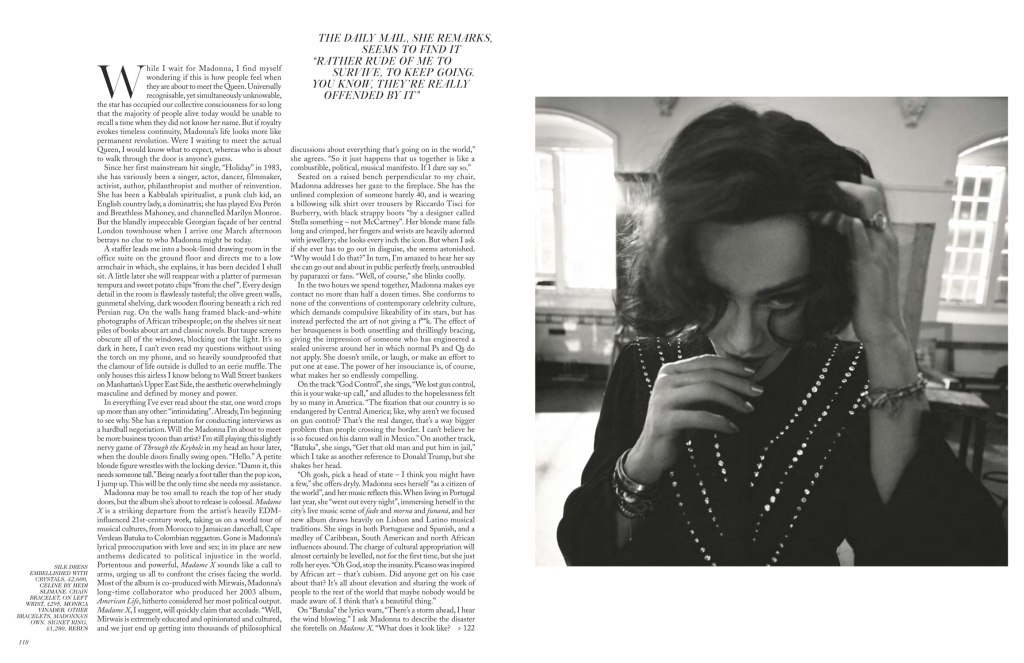 La entrevista fue realizada durante el mes de marzo en la mansión que Madonna posee en la ciudad de Londres. La estética elegida es en blanco y negro y fue inspirada por varios modelos femeninos de poder e independencia a los que Madonna admira y se siente reflejada: mujeres feministas del siglo XX. La dirección de estilo estuvo a cargo de Benjamin Bruno, peinado por Andy LeCompte, maquillaje por Isamaya Ffrench, manicuría por Jenny Longworth y el diseño del set por Emma Roach.