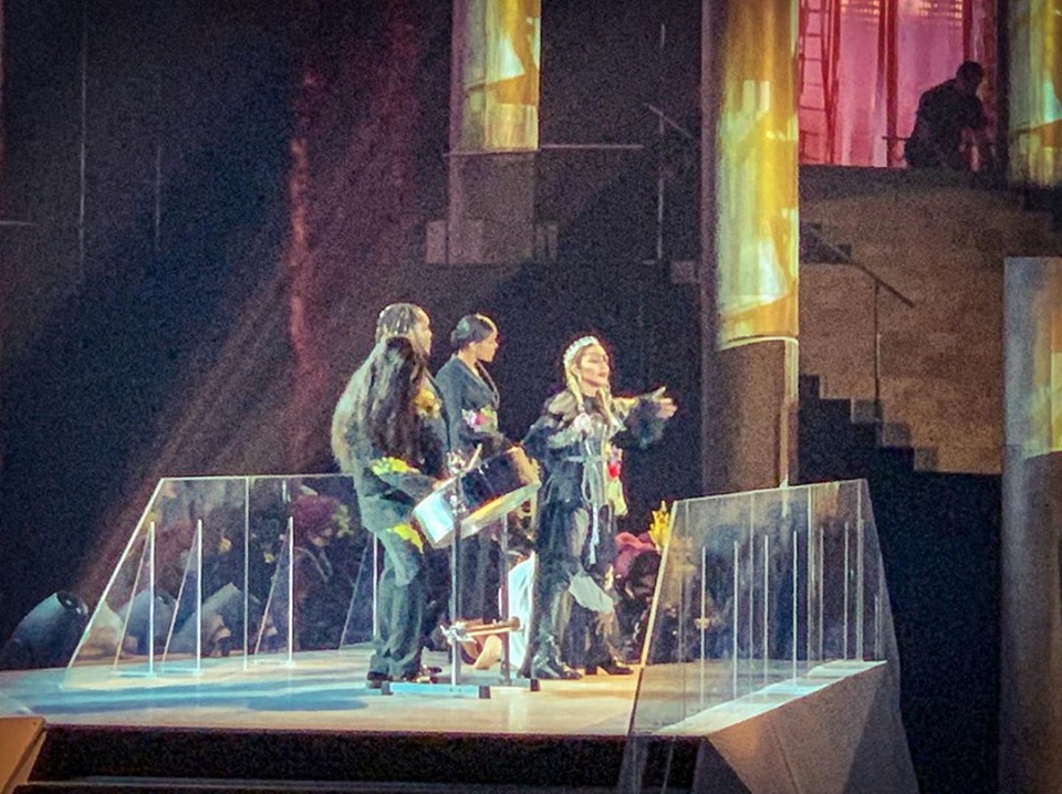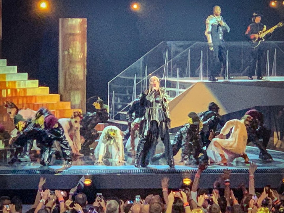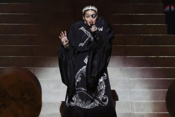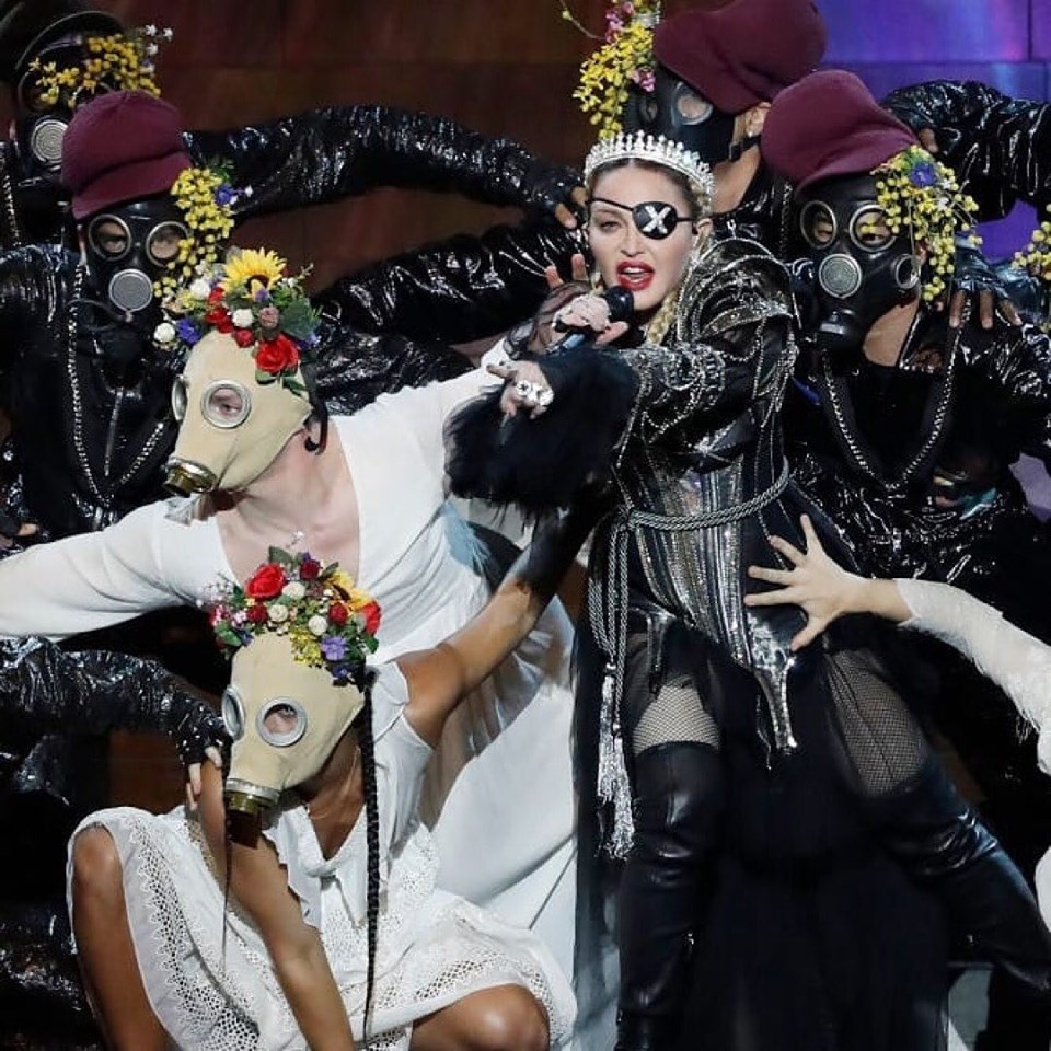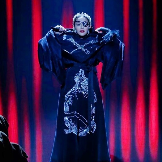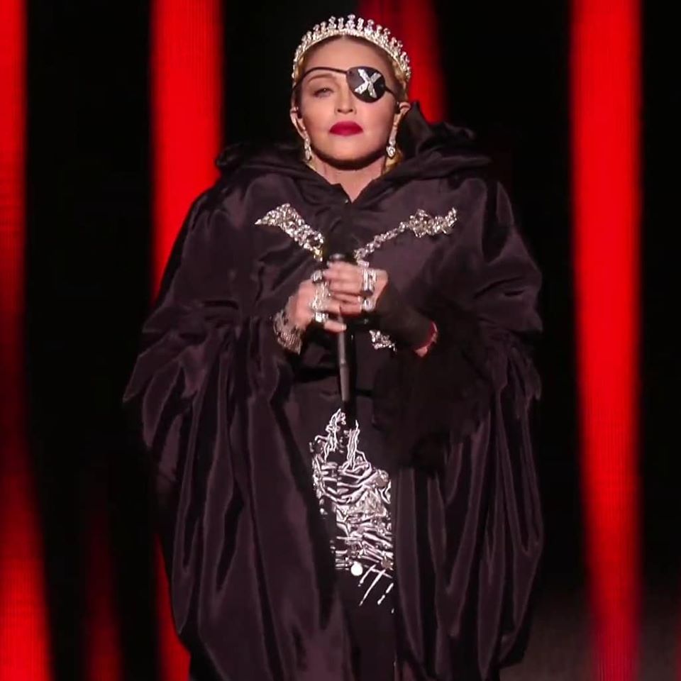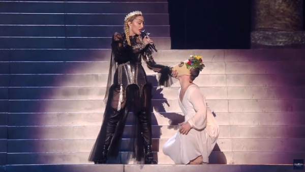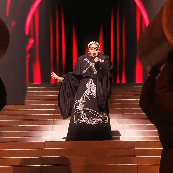 La primera canción que se interpretó fue «Like a Prayer» con una puesta bastante similar a la realizada durante la gala del MET en New York en mayo de 2018. El escenario central estaba formado por una gran escalera en donde se posicionaron a los costados dos hileras de 16 monjes gregorianos que entonaron “Madonna” como cántico. Madonna aparece en el centro de la escalera gracias al elevador; usando una túnica negra con una gran «X» bordada en el pecho y totalmente encapuchada; luego de los primeros versos, se descubre la cara para mostrar una corona de diamantes, su cabello rubio recogido en dos trenzas y el típico parche en el ojo izquierdo que representa a su nuevo alter ego «Madame X». Madonna no se ha lucido con la interpretación en vivo, de hecho en algunos momentos le ha costado encontrar el tono correcto y se la escuchó bastante desafinada; muchos luego explicaron que fue debido al auricular. Madonna canta mientras desciende la escalera, hacia el final de la canción se encuentra con un grupo de monjes que la rodean mientras ella está tendida en el suelo. Los monjes se quitan las túnicas y se descubren cuatro bailarinas usando vestidos blancos y máscaras de gas con un arreglo floral en la cabeza. Ellas danzan alrededor de Madonna y la despojan de su túnica.