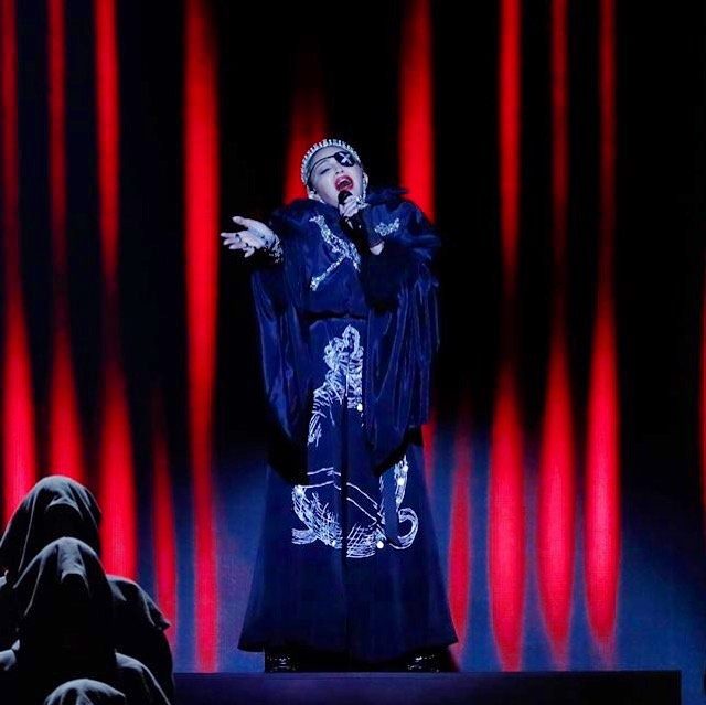 Para la actuación en sí, Madonna lució al inicio del show una túnica de monje en color negro, con una gran «X» bordada en su pecho haciendo alusión al nuevo disco «Madame X». «Creo que Madonna y yo estamos tratando de inspirar a las mujeres y chicas y darles coraje para que se expresen y sean fuertes e independientes» comentó. Otras inspiraciones fueron Milla Jovovich en el film «The Messenger» y antiguas fotografías de bailarinas exóticas del siglo pasado. Esta no sería la primera vez que Madonna usa un diseño de Findikoglu. En 2017, la cantante lució el traje «Garden of Eden» durante su presencia en la Gala de St. Tropez. Más recientemente ha usado un saco hecho a medida para una entrevista de promoción de su último disco. Findikoglu ha expresado abiertamente su admiración por Madonna y la ha llamado «mi eterna inspiración». En 2018, la diseñadora creó una serie de camisetas evocativas al famoso corset con corpiño cónico que Jean-Paul Gaultier realizaría para el «Blond Ambition Tour» de 1990.
