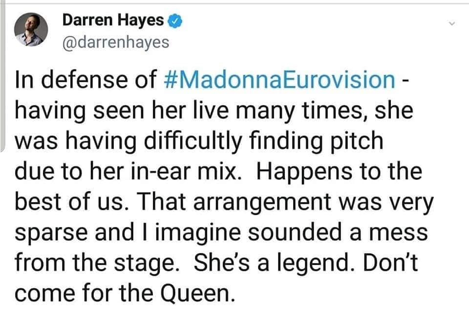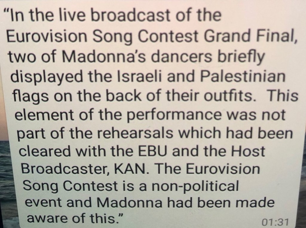 Días previos se había desatado una polémica en las redes debido a que fuentes oficiales habían anunciado que la actuación de Madonna en el certámen no era segura porque no se había realizado la firma de ningún contrato. Esto comenzó a generar especulaciones y algunos afirmaban que la cantante se había dado de baja del show. El organizador ejecutivo de «Eurovision», Jon Ola dijo el día lunes: «La European Broadcasting Union nunca ha confirmado la presencia de Madonna como un acto. Si no tenemos un contrato firmado, ella no podrá subir al escenario».