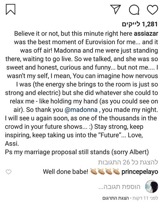 Aznar se notaba tenso y nervioso y tal vez no supo aprovechar el momento para entrevistar con mayor inteligencia a Madonna, incluso bromeó con casarse con ella siendo abiertamente gay. En Instagram Aznar declaró: “Créanlo o no, este momento fue el mejor para mí. Madonna y yo estábamos ahí esperando para salir en vivo. Asi que conversamos y ella fue tan dulce y honesta, y divertida y curiosa…pero no yo. Yo no era yo, quiero decir pueden imaginar lo nervioso que estaba (la energía que ella desprende era tan fuerte y eléctrica) pero ella hizo todo lo posible para tranquilizarme como sostener mi mano. Gracias Madonna, hiciste mi noche. Te veré pronto entre los miles de fans que asistirán a tus shows. Mantente fuerte, sigue inspirando, sigue llevándonos al ‘Futuro’…con amor Assi. PD: mi propuesta de matrimonio aún sigue en pie (perdón Albert)”.