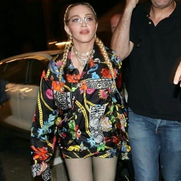 Conjunto «Versace» de seda compuesto por chaqueta extragrande y shorts con estampado de flores, cadenas y arabescos coloridos sobre fondo negro. Las prendas forman parte de la última colección primavera 2019. Con este mismo conjunto, Madonna subió un video a Instagram en donde se la ve bailando en el baño de su mansión de New York.
