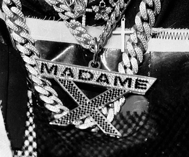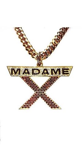 - Colgante con cadena de oro y medalla con cristales modelo «Madame X» realizado especialmente para Madonna por Stephen Webster.